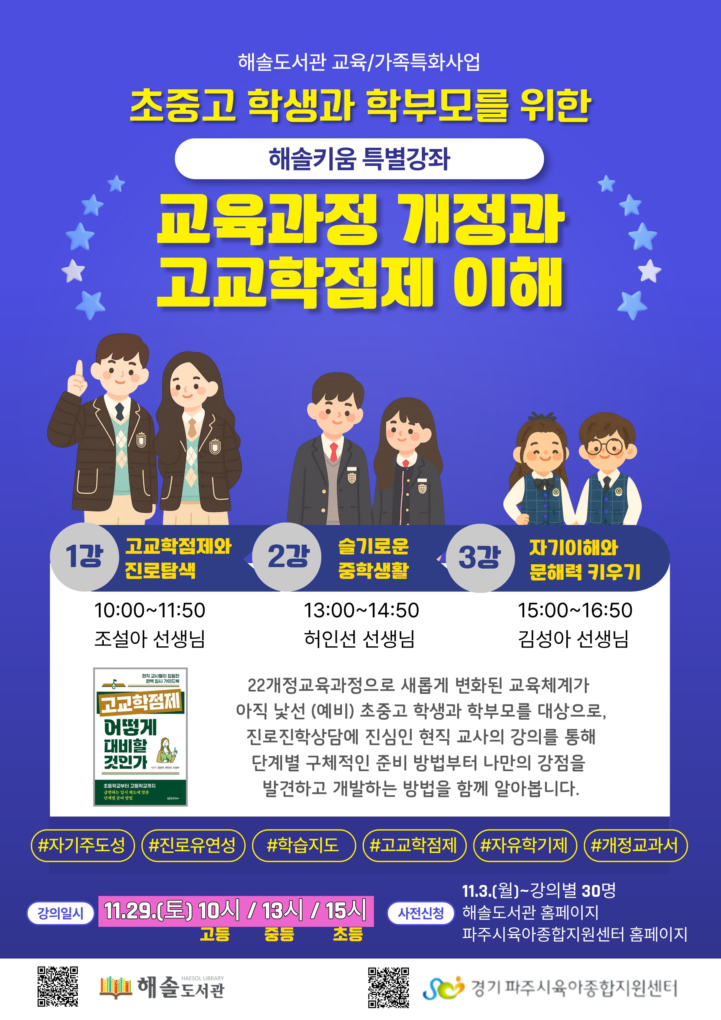 | 프로그램명 | 접수중 [해솔키움*초등] 초등교육 시기, 자기 이해와 문해력 키우기 : 교육과정 개정과 고교학점제 이해(3강 김성아 선생님) |