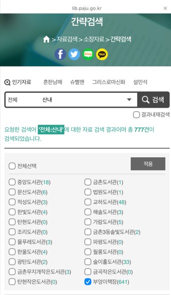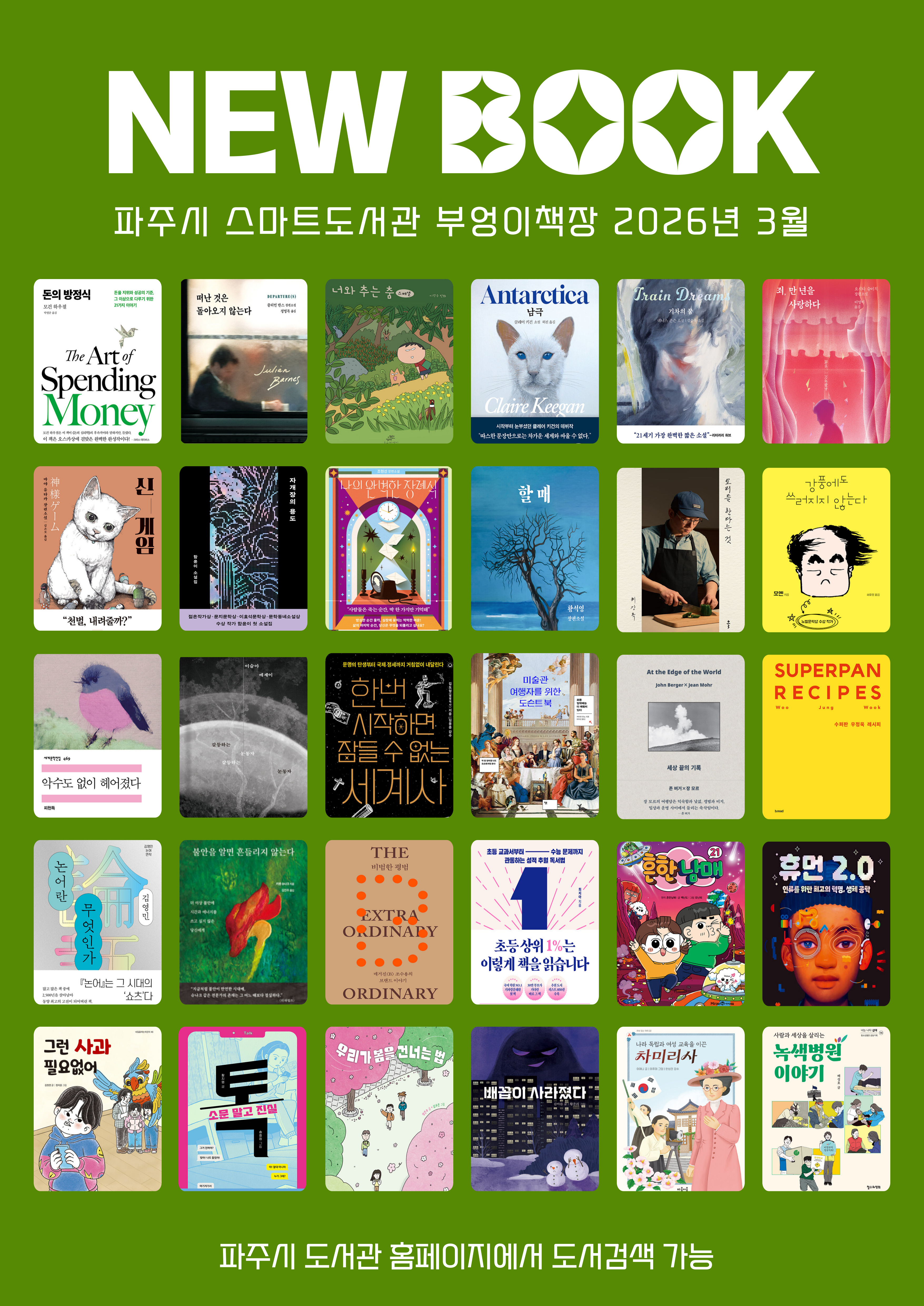 파주시 부엉이책장에 2026년 3월 신간도서가 비치되었습니다. 파주시 도서관 홈페이지에서 도서검색이 가능합니다. 각 부엉이책장별 소장도서를 보고 싶으시면 부엉이책장을 체크 후, 도서 검색창에 '문산역', '산내', '야당역'을 입력해 주세요. 현재 소장중인 도서 목록이 검색됩니다. ![]() ![]() ![]() 부엉이책장의 소식은 인스타그램에서도 확인 가능합니다. ☞ 부엉이책장 인스타그램 바로가기 ![]() <자세한 이용방법 클릭> ☞ 야당역/문산역 부엉이책장 ☞ 산내부엉이책장 ☞ 파주시도서관 《카카오톡 챗봇 서비스》 |
