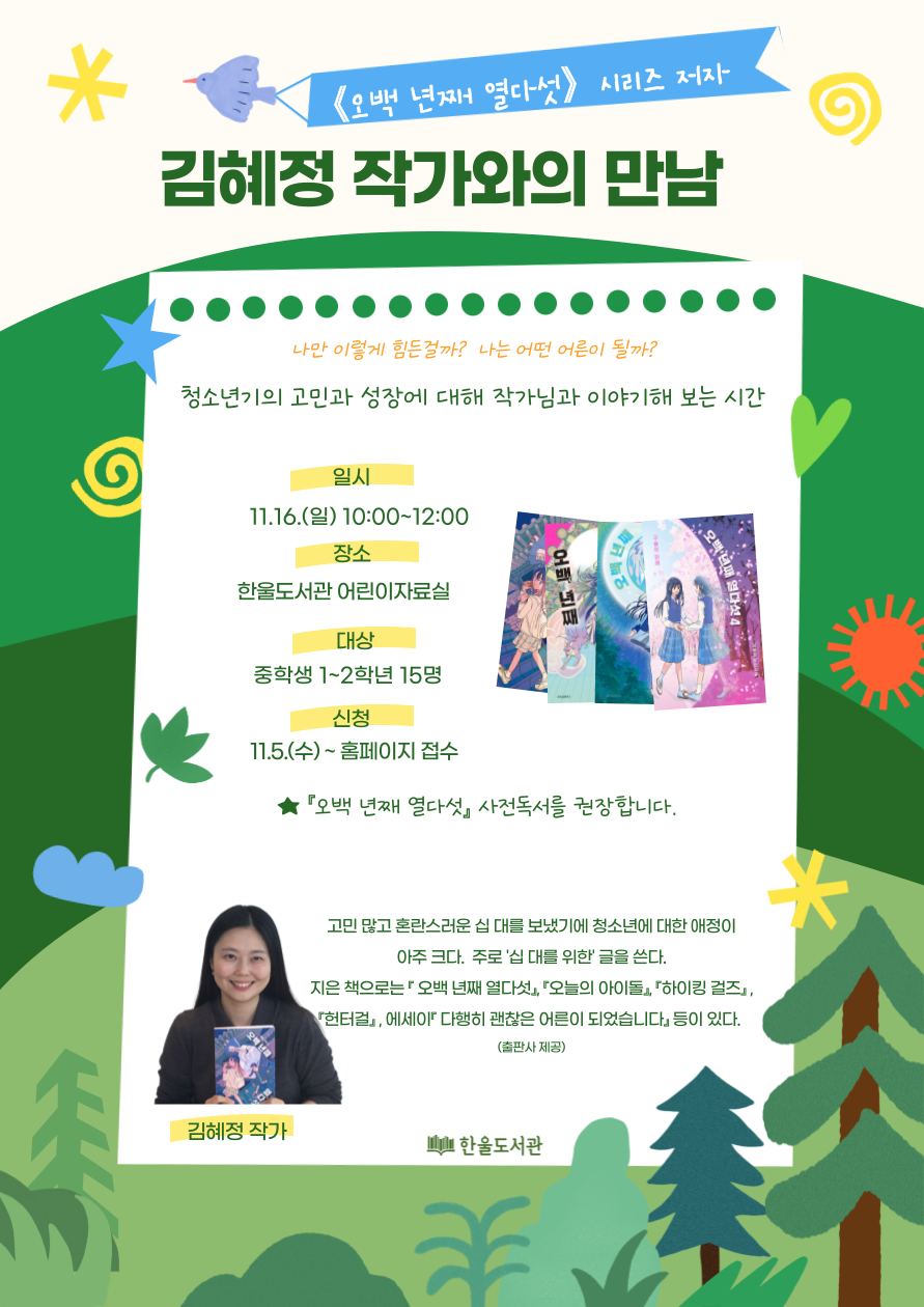 📕한울도서관 작가와의 만남 📚 < 김혜정 작가와의 만남 > '나만 이렇게 힘든걸까?' '나는 어떤 어른이 될까?' 청소년 인기도서 『오백년째 열다섯』시리즈의 저자 김헤정 작가님과 청소년기의 고민과 어려움에 대해 함께 이야기를 나누며 힐링하는 시간을 가져보아요. 망설이지 말고 신청해주세요! ◆ 대상 : 중학생 1~2학년 15명 ◆ 일시 : 11. 16.(일) 10:00 ~ 12:00 ◆ 장소 : 한울도서관 어린이자료실 ◆ 진행 :김혜정 작가(『오백 년째 열다섯』시리즈 저자) ◆ 신청 : 11. 5.(수) 9:00 ~ 홈페이지 선착순 접수 ◆ 문의 : 031-940-5045(5000) ★『오백 년째 열다섯』사전독서를 권장합니다.