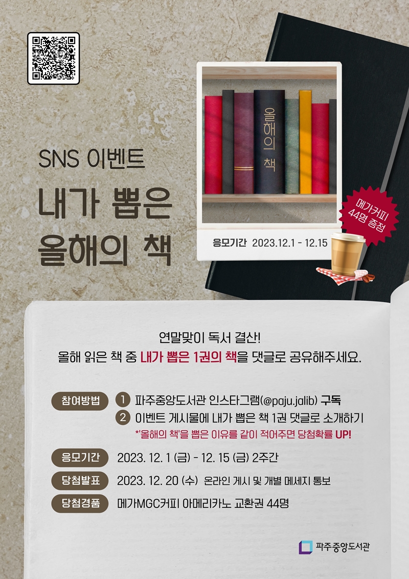 [SNS 이벤트] 내가 뽑은 올해의 책📖 연말맞이 독서 결산! 2023년에는 몇 권의 책을 읽으셨나요? 올해 읽은 책 중 내가 뽑은 1권의 책을 이벤트 게시물에 댓글로 공유해주세요. - 응모기간: 2023. 12. 1(금) ~ 12. 15(금) 2주간 - 참여장소: 파주중앙도서관 공식 인스타그램(@paju.jalib) - 당첨발표: 2023. 12. 20(수) 온라인 게시 및 개별 메세지 통보 - 당첨경품: 커피교환권 44명 - 참여방법 1. 파주중앙도서관 인스타그램(@paju.jalib) 구독 2. 이벤트 게시물에 내가 뽑은 책 1권 댓글로 소개하기 *'올해의 책'을 뽑은 이유를 같이 적어주면 당첨확률 UP! ![]() *이 제작물은 미리캔버스로 디자인되었습니다. |
