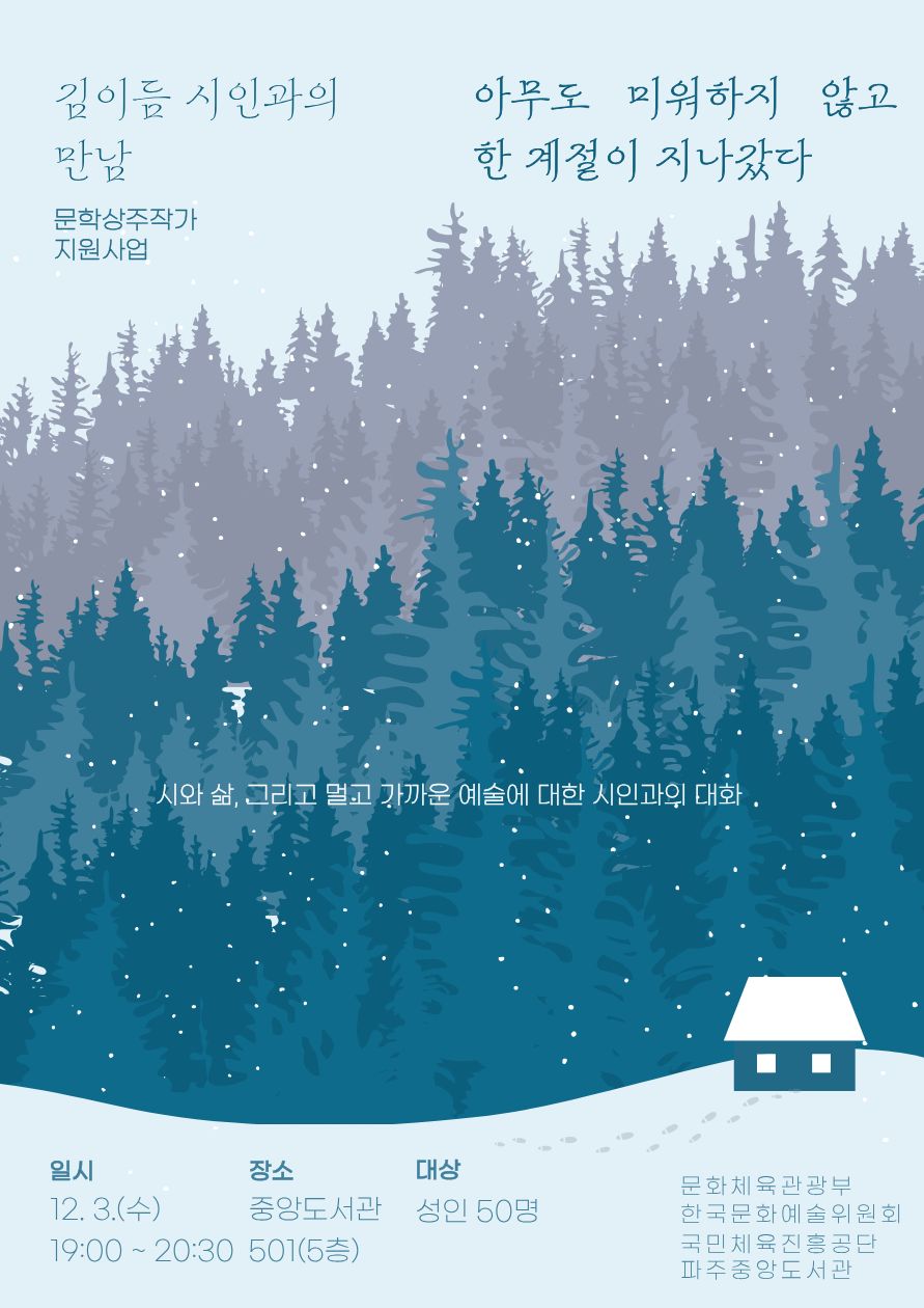 [문학상주작가 지원사업] 아무도 미워하지 않고 한 계절이 지나갔다 김이듬 시인과 시를 읽고 쓰면서 한겨울을 지내기로 하는 독자들의 만남의 자리입니다. 시와 삶, 그리고 멀고 가까운 예술에 대한 시인과의 대화에 여러분을 초대합니다. _일시 : 12. 3.(수) 19:00 ~ 20:30 _장소 : 중앙도서관 501(5층) _대상 : 성인 50명 _강사 : 김이듬 시인 ![]() |
