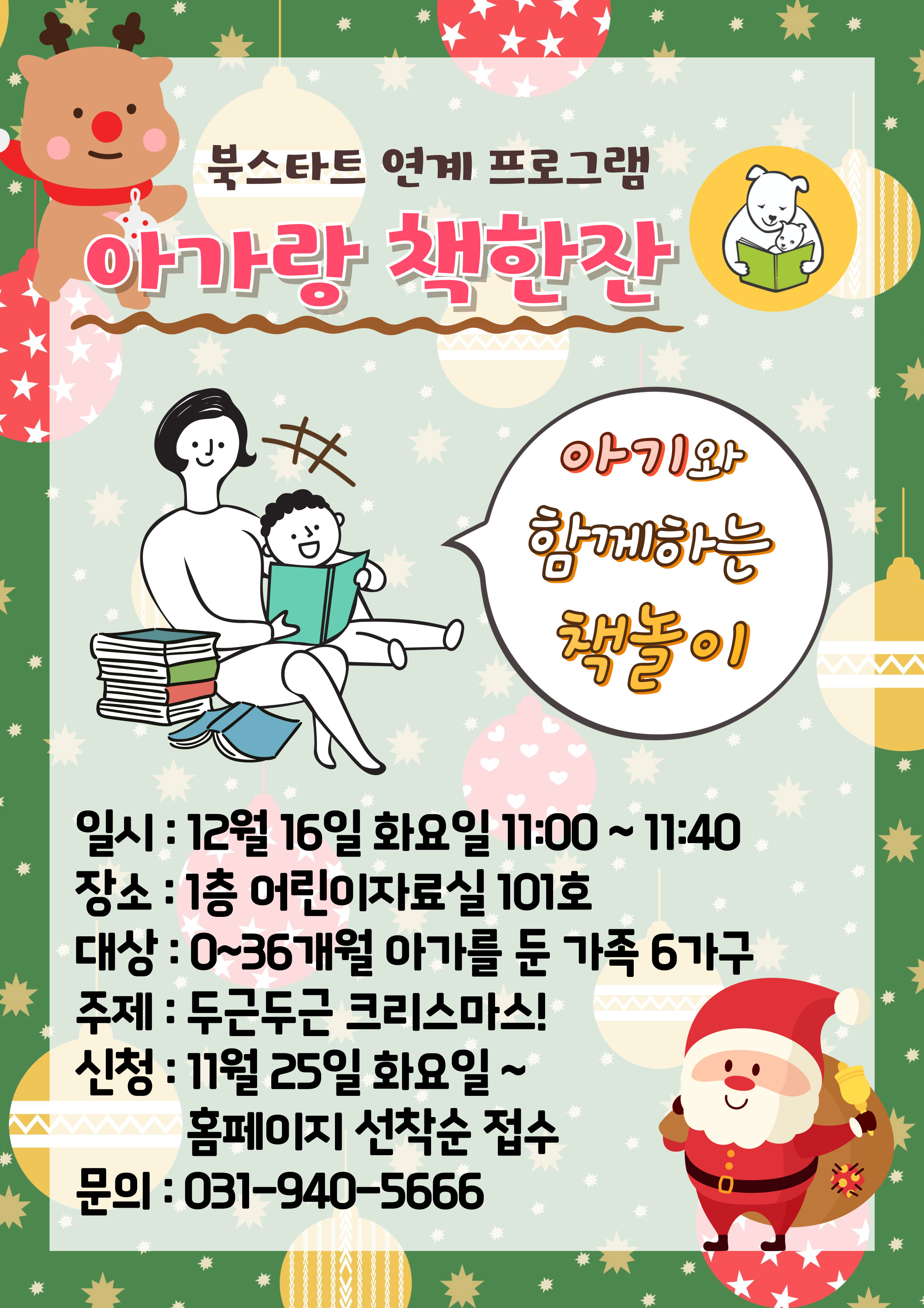 [2025년 12월] 북스타트 연계 프로그램 <아가랑 책한잔> 일시 : 12월 16일 (화) 11:00~11:40 장소 : 1층 어린이자료실 101호 (학습만화방) 대상 : 0~36개월 영유아와 양육자 6가구 진행 : 북스타트 동아리 <책에 빠진 사람들>, 사서 정미진 내용 : 겨울, 크리스마스와 관련된 영유아 그림책 읽기, 동요에 맞춘 율동 몸놀이 ※ 쌍둥이 자녀 신청방법 신청은 양육자분 명의의 계정으로 진행하시고, 참가자명 기입란에 자녀들의 성명을 입력해주세요. 아기와 함께 즐거운 책놀이는 어떠신가요? 매월 다른 주제로 선정된 그림책을 읽어주고 책놀이를 함께하며 아기와 소통하고, 동료 양육자들과 서로의 육아 고충부터 노하우까지 함께 나누는 즐거운 책모임 시간에 여러분을 초대합니다.