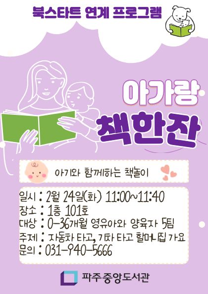 [2026년 2월] 북스타트 연계 프로그램 <아가랑 책한잔> 일시 : 2월 24일 (화) 11:00~11:40 장소 : 1층 어린이자료실 101호 (학습만화방) 대상 : 0~36개월 영유아와 양육자 5가구 진행 : 북스타트 동아리 <책에 빠진 사람들>, 어린이자료실 담당 사서 내용 : 탈것을 주제로 한 영유아 그림책 읽기, 동요에 맞춘 율동 몸놀이 신청 : 2. 3.(화)부터 선착순 아기와 함께 즐거운 책놀이는 어떠신가요? 매월 다른 주제로 선정된 그림책을 읽어주고 책놀이를 함께하며 아기와 소통하고, 동료 양육자들과 서로의 육아 고충부터 노하우까지 함께 나누는 즐거운 책모임 시간에 여러분을 초대합니다.