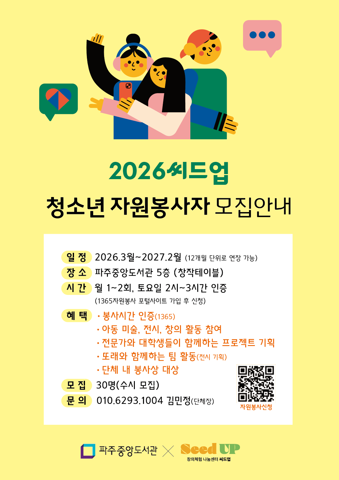[씨드업 8기 모집] 일정: 2026.4월 시작(매월 1,2주 토요일) 장소: 파주중앙도서관 5층 창작테이블 시간: 오전 10시 50분 학년: 1~4학년(저학년 우선 모집) 신청 상담: 010-3777-9510 및 포스터 내 QR코드 접속 *무료체험으로 진행합니다.(재료비 별도/문의) 대관일정에 따라 변동될 수 있습니다. 자세한 일정은 블로그 공지를 통해 확인 가능합니다. 활동 장소와 시간은 상황에 따라 변동될 수 있습니다. ![]() [2026씨드업 청소년 자원봉사자 모집안내] 일정: 2026.3월~2027.2월 (12개월 단위로 연장 가능) 장소: 파주중앙도서관 5층(창작테이블) 시간: 월 1~2회, 토요일 2시~3시간 인증(1365자원봉사 포털사이트 가입 후 신청) 혜택 - 봉사시간 인증(1365) - 아동 미술, 전시, 창의 활동 참여 - 전문가와 대학생들이 함께하는 프로젝트 기획 - 또래와 함께하는 팀 활동(전시 기획) - 단체 내 봉사상 대상 모집: 30명(수시 모집) 문의: 010-6293-1004 및 포스터 내 QR코드 접속