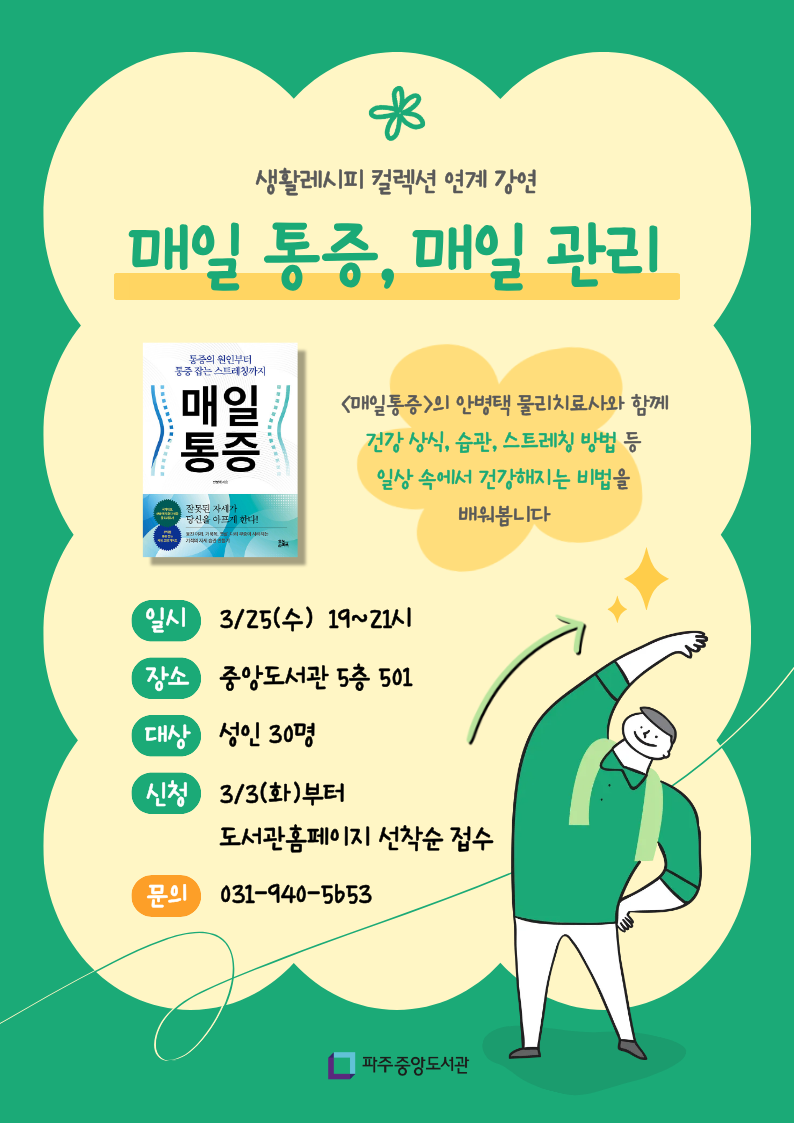 [생활레시피 컬렉션 연계강연] <매일 통증, 매일 관리> 「매일 통증」의 안병택 물리치료사님과 함께 건강 상식, 올바른 생활 습관, 스트레칭 방법 등 일상 속에서 건강해지는 비법을 배워봅니다. ○ 일시 : 3/25(수) 19~21시 ○ 장소 : 중앙도서관 5층 501 ○ 대상 : 성인 30명 ○ 신청 : 3/3(화)부터 도서관 홈페이지 선착순 접수 ○ 문의 : 중앙도서관 커뮤니티실 / 031-940-5653