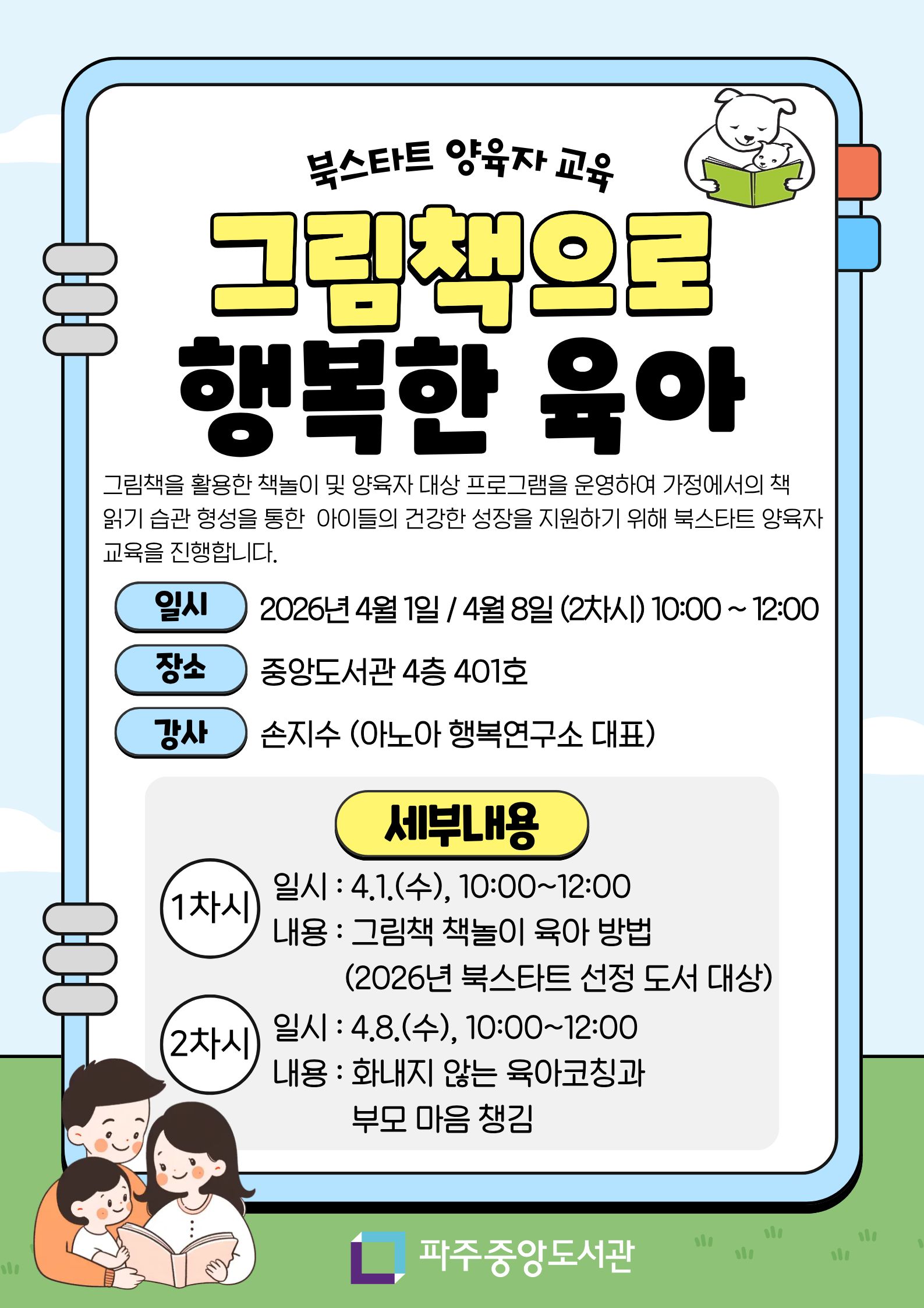[북스타트 양육자 교육] 그림책으로 행복한 육아 (2차시) 그림책을 활용한 책놀이 및 양육자 대상 프로그램을 운영하여 가정에서의 책 읽기 습관 형성을 통한 아이들의 건강한 성장을 지원하기 위해 북스타트 양육자 교육을 진행합니다. 일 시_ 4. 8.(수) 10:00 ~ 12:00 대 상_ 성인 25명 장 소_ 중앙도서관 401호 (4층) 강 사_ 손지수 (아노아 행복연구소 대표) 내 용_ 화내지 않는 육아코칭과 부모 마음 챙김 (상황별 훈육 코칭과 부모 마음 돌봄 그림책 테라피) 신 청_ 3. 12.(수) ~ 도서관 홈페이지 ※ 교육 주제와 관련하여 평소 궁금했던 사항을 작성(첨부파일)해서 중앙도서관 담당자 메일(bookiii@korea.kr)로 보내주세요.