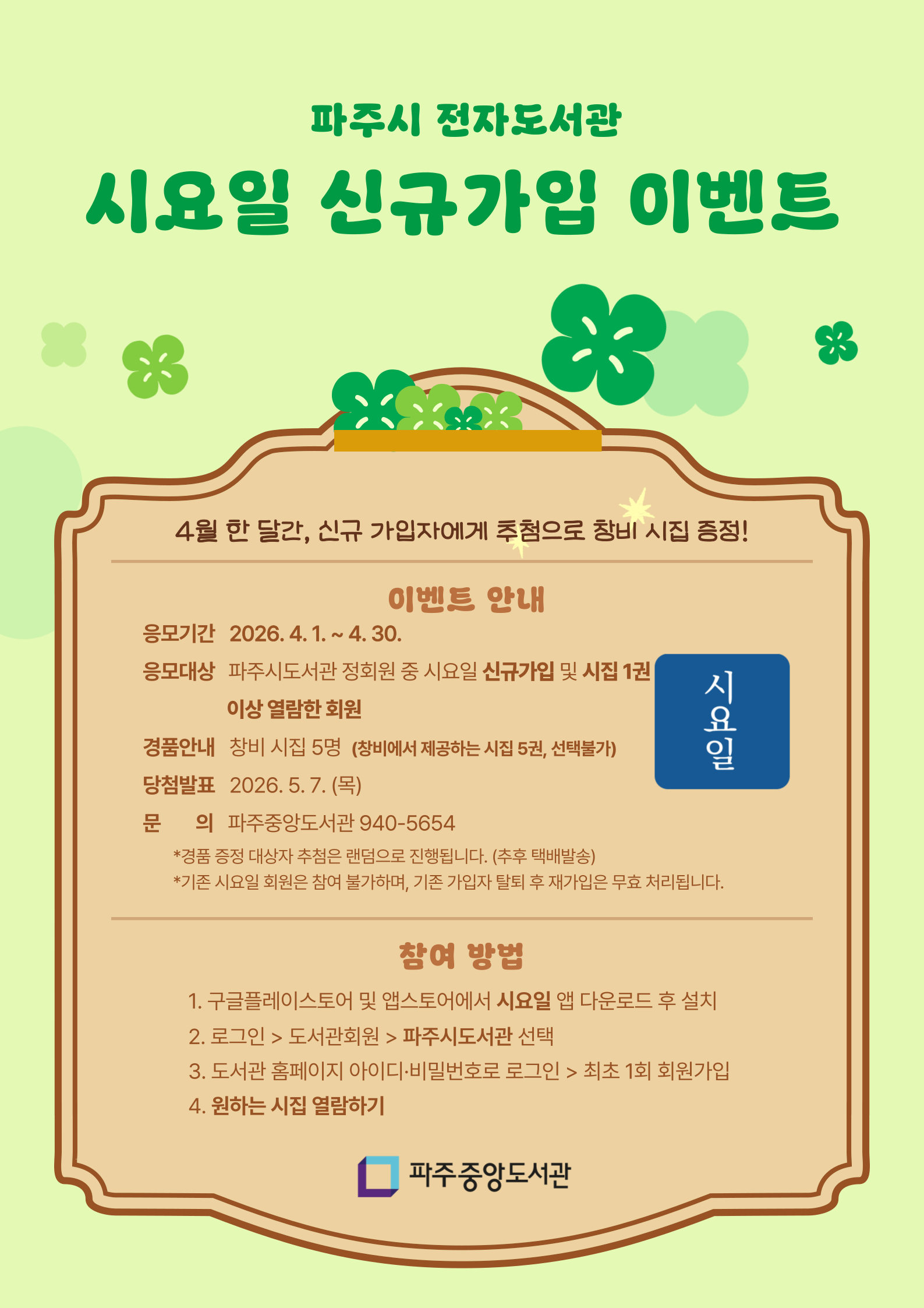 <시요일 신규가입 이벤트> ✅ 이벤트안내 - 응모기간: 2026. 4. 1. ~ 4. 30. - 응모대상: 파주시도서관 정회원 중 '시요일' 신규가입 및 시집 1권 이상 열람한 회원 - 경품안내: 창비 시집 5명 (창비에서 제공하는 시집 5권, 선택불가) - 당첨발표: 2026. 5. 7. (목) - 문의: 파주중앙도서관 도서관운영팀 (940-5654) *경품 증정 대상자 추첨은 랜덤으로 진행됩니다. (추후 택배발송) *기존 시요일 회원은 참여 불가하며, 기존 가입자 탈퇴 후 재가입은 무효 처리됩니다. ✅ 참여방법 1. 구글플레이스토어 및 앱스토어에서 시요일 앱 다운로드 후 설치 2. 로그인 > 도서관회원 > '파주시도서관' 선택 3. 도서관 홈페이지 아이디·비밀번호로 로그인 > 최초 1회 회원가입 4. 원하는 시집 열람하기 *이 제작물은 미리캔버스로 디자인되었습니다. ![]() |
