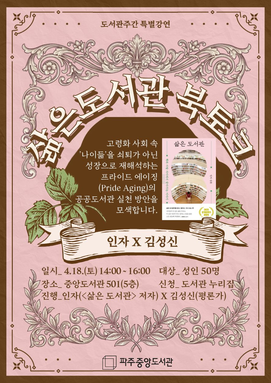 [도서관주간 특별강연] <삶은 도서관 북토크> 고령화 사회 속 '나이듦'을 쇠퇴가 아닌 성장으로 재해석하는 프라이드 에이징(Pride Aging)의 공공도서관 실천 방안을 모색하는 시간을 마련하였습니다. 일 시_ 4. 18.(토) 14:00 ~ 16:00 대 상_ 성인 50명 장 소_ 중앙도서관 501(5층) 진 행_ 인자(<삶은 도서관>저자) X 김성신(출판평론가) 신 청_ 3. 28.(토) 09:00 ~ 도서관 홈페이지 ![]() |