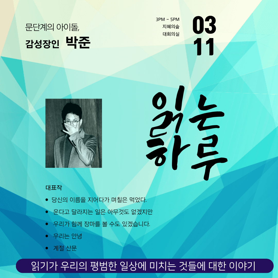| 프로그램명 | 접수중 (전체)문단계의 아이돌 박준 작가 강연 '읽는 하루' |
