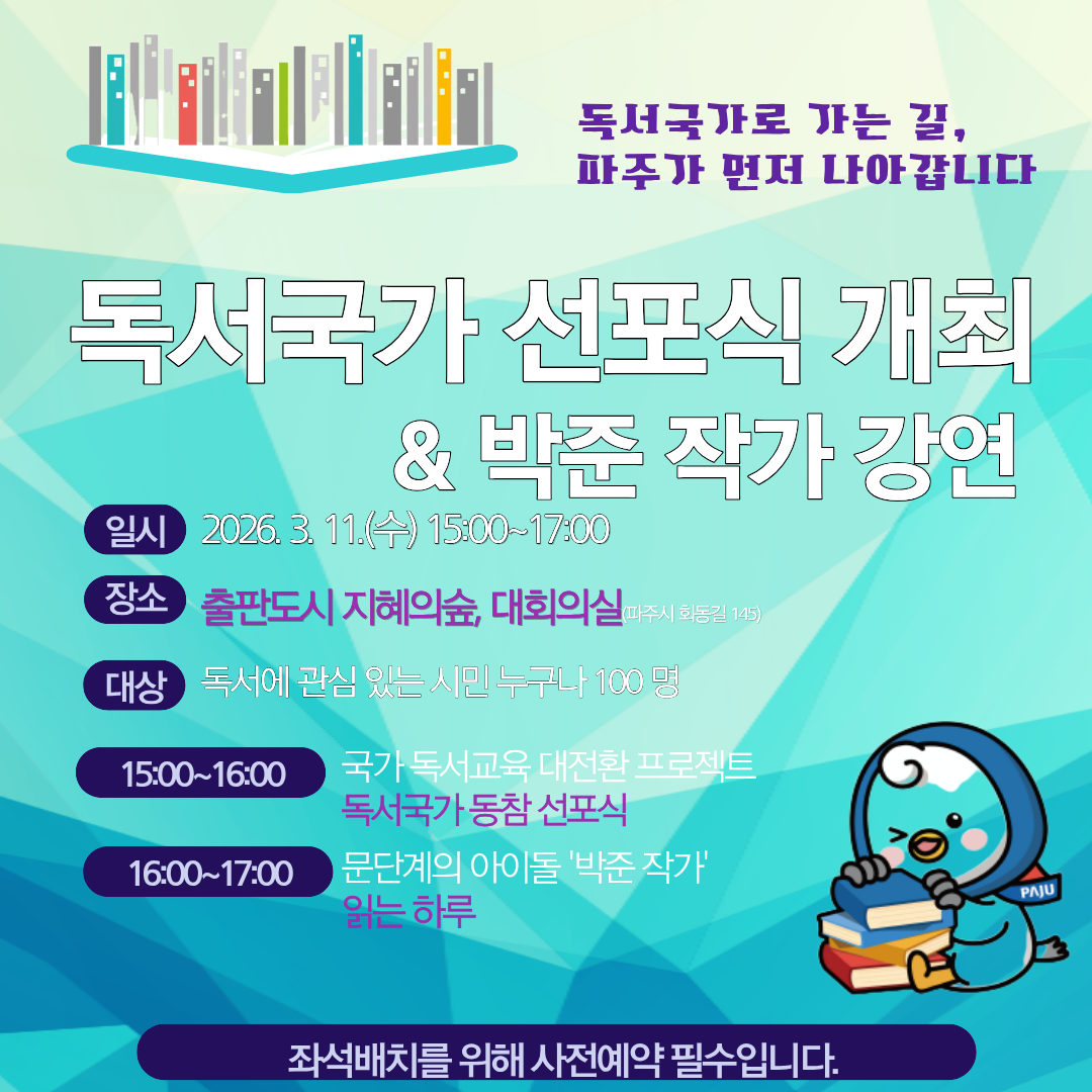 ► 본 강연은 파주시 '독서국가 선포식'의 부대행사 입니다. ( 15:00~16:00 선포식 / 16:00~17:00 읽는 하루 ) ► 많은 참여 바랍니다. ![]()