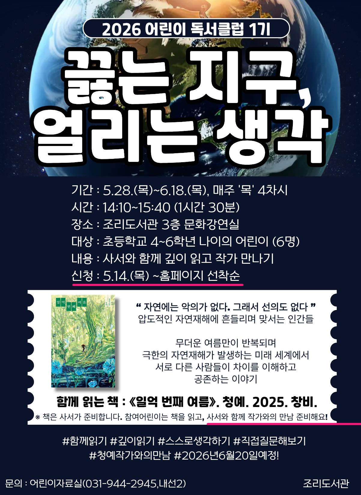 📚 [2026 어린이 독서클럽 1기] 끓는 지구, 얼리는 생각 사서와 함께 깊이 읽고, 작가님과 만나요! 긴 책을 혼자 읽기 힘들었나요? 사서 선생님, 친구들과 함께라면 끝까지 즐겁게 읽을 수 있어요! 한 책을 깊이 읽고, 내가 직접 준비한 질문으로 청예 작가님과 대화 나누는 특별한 주인공이 되어보세요. ✨ --- 🗓️ 독서클럽 일정 (총 4차시) * 일시: 2026. 5. 28. (목) ~ 6. 18. (목) 매주 목요일 * 시간: 14:10 ~ 15:40 (90분) * 장소: 조리도서관 3층 문화강연실 * 내용: 청예 작가의 《일억 번째 여름》 완독 & 작가와의 만남 준비 📖 🎤 연계 행사: 청예 작가와의 만남 * 일시: 2026. 6. 20. (토) 10:00 ~ 12:00 * 내용: 작가에게 직접 질문하고 대화하는 생생한 북토크 활동 --- 👥 모집 안내 * 대상 : 초등 4~6학년 6명 * 신청시작 : 2026. 5. 14. (목)~ * 신청방법 : 조리도서관 홈페이지 온라인 접수 📗 함께 읽는 책 《일억 번째 여름》. 청예. 2025. 창비. - 환경 문제와 SF적 상상력이 맞닿아 있어 재미있게 읽을 수 있어요! 📚 함께 하는 활동 - 기후위기와 희망적 미래를 서술하는 SF 장르인 '솔라펑크'를 알아볼거에요. - 소설속에 묘사된 여름을 함께 찾아볼거에요. - 인물 소개 자료를 만들어보고 기후위기 상황에서 나의 역할을 생각해 볼 거에요. - 작가님이 만든 게임 <모두의 봄>도 함께 해봐요. - 작가와의 만남 행사의 기획자, 사회자가 되어, 함께 북토크를 준비해볼거에요. --- 🌟 이런 친구들을 기다려요! * 🌡️ 기후 위기와 환경 문제에 관심이 많은 친구 * 📖 긴 호흡의 책을 끝까지 멋지게 읽어내고 싶은 친구 * 🙋 작가님께 직접 궁금한 점을 묻고 대화하고 싶은 적극적인 친구 조금 두꺼운 책도 재미있어요! 사서 선생님과 함께라면 책 읽는 즐거움이 두 배가 됩니다. 조리도서관에서 만나요~😊❤️