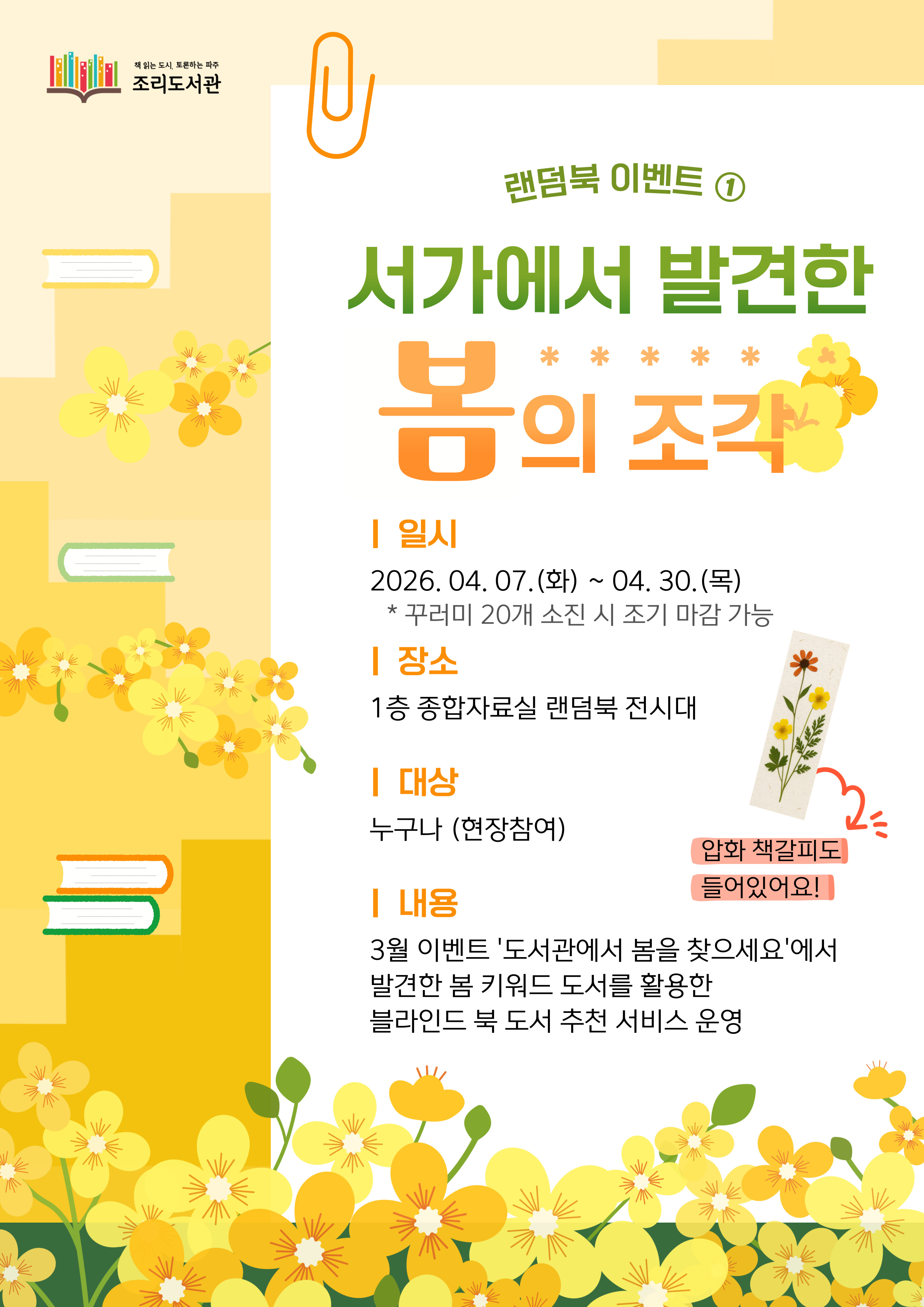 *미리캔버스에서 제작된 이미지입니다. 랜덤북 이벤트 ① <서가에서 발견한 봄의 조각> "3월, 이용자가 직접 찾은 봄 이야기" 표지를 감추고 설렘을 더해 압화 책갈피와 함께 준비했습니다. 일시: 4. 7.(화) ~ 4. 30.(목) *꾸러미 20개 소진 시 조기 마감 가능 장소: 1층 종합자료실 랜덤북 전시대 대상: 누구나 방법: 1인 1랜덤북 대출, 초과 대출 가능 내용: 3월 이벤트 '도서관에서 봄을 찾으세요'에서 발견한 봄 키워드 도서를 활용한 블라인드 북 도서 추천 서비스 운영 문의: 031-944-2945 (내선 1 종합자료실) |