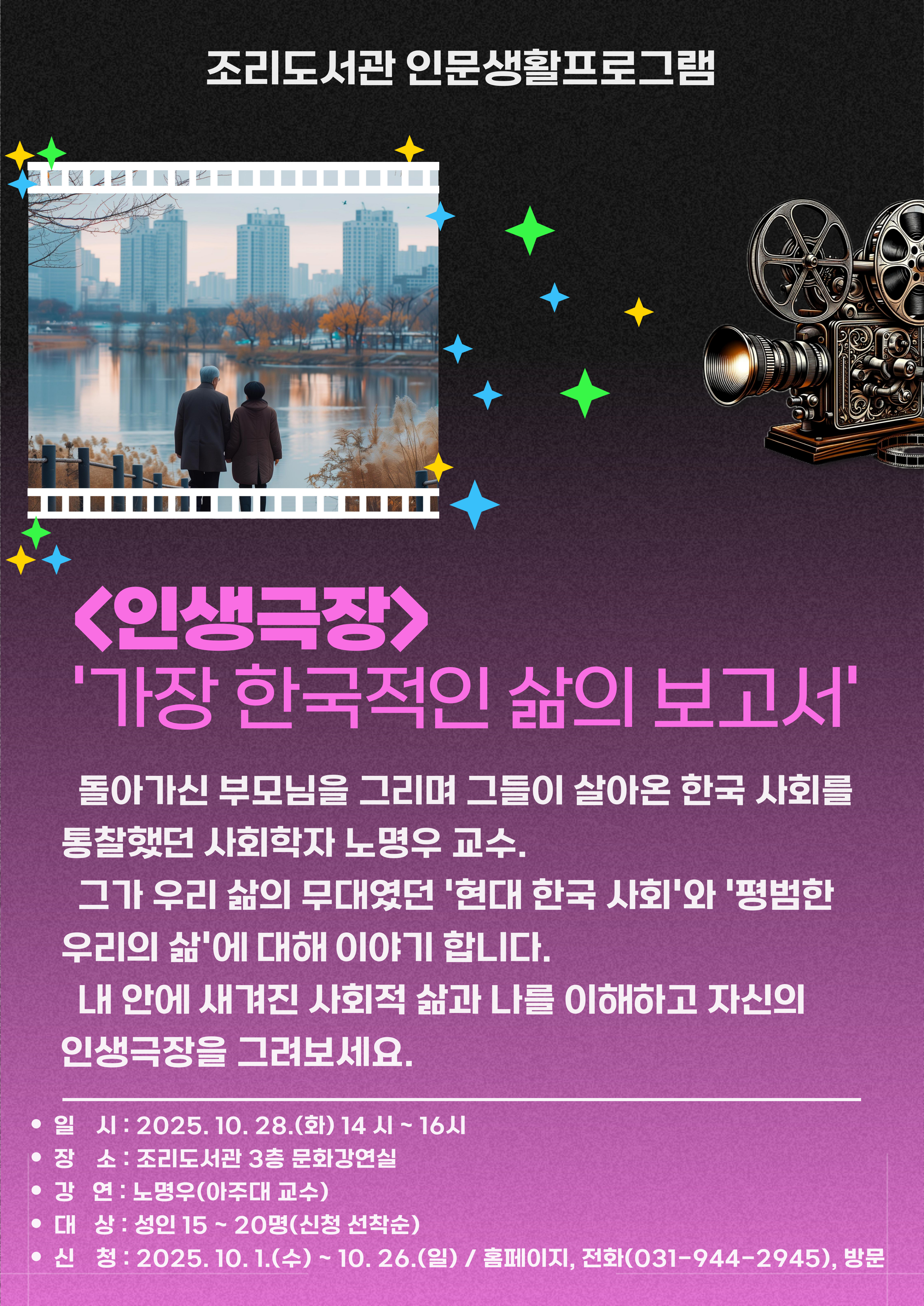 내안의 새겨진 사회적 삶과 나를 만나보세요. 부모님을 여의고, 부모님을 이해하기 위해, 부모님의 삶의 무대였던 한국 사회를 통찰했던 사회학자 노명우 교수. 그가 우리 삶의 무대였던 '현대 한국 사회'와 '평범한 우리의 삶'에 대해 이야기 합니다. 강연을 통해 자신이 살아온 사회와 삶을 이해하고 이를 통해, 자신의 인생극장을 그려보세요. [조리도서관] 인문생활프로그램 <인생극장_가장 한국적인 삶의 보고서> - 일시 : 2025년 10월 28일(화) 14시 ~ 16시 - 장소 : 조리도서관 3층 문화강연실 - 대상 : 성인 15~ 20명(선착순 접수) - 강사 : 노명우 교수(아주대) - 신청 : 온라인, 전화, 방문 * 전화 : 031-944-2945 * 본 프로그램은 파주도서관 소식지 PLAY 10월호에 게시된 '인생극장_영화로 그려 본 한국인의 삶'과 같은 프로그램입니다 준비 과정에서 프로그램 명칭이 변경된 점 양해해 주시기 바랍니다.