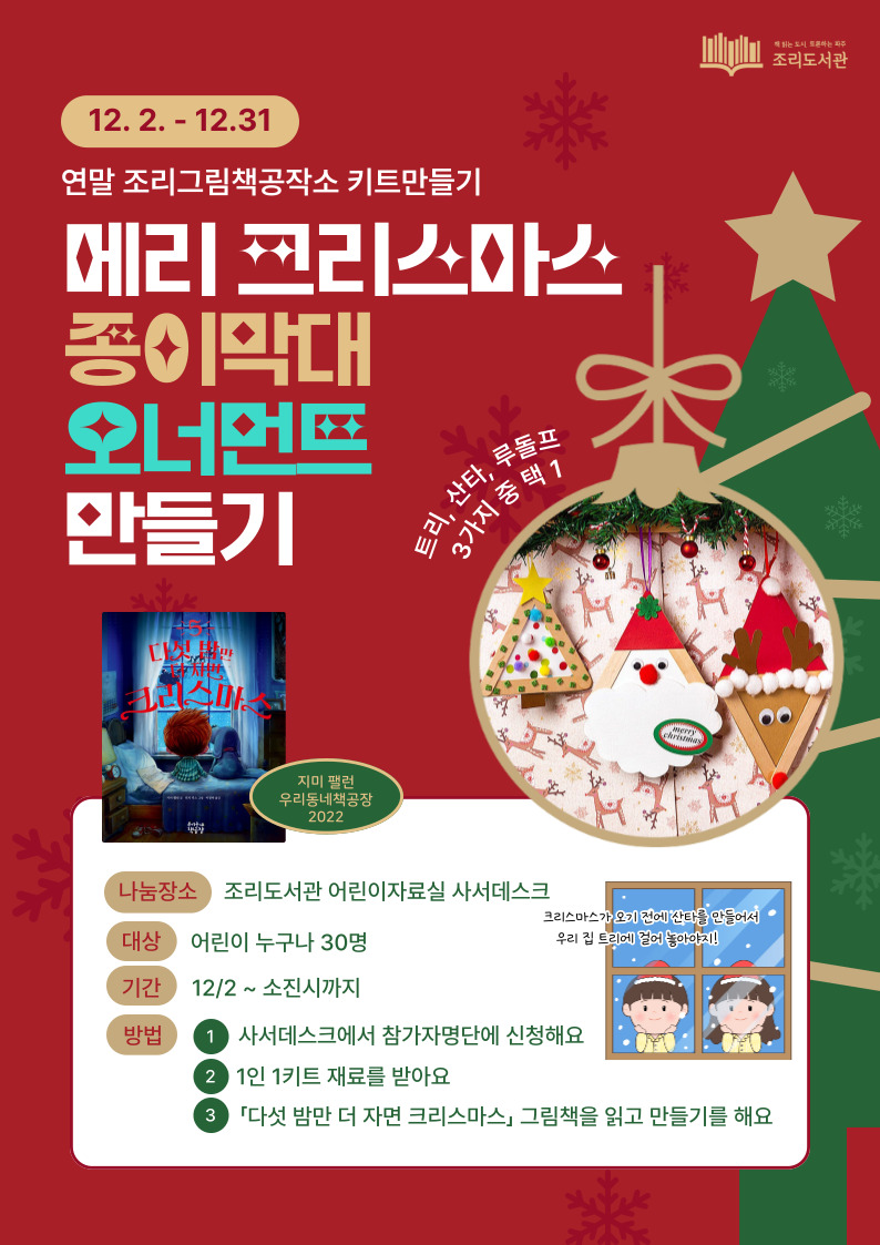 연말 조리그림책 공작소 주제는 "포근포근 겨울 그림책이 좋아!" 입니다. 주제에 맞춰 《메리 크리스마스 종이막대 오너먼트 키트》를 준비했어요. 크리스마스 트리? 어디든 붙여놓으면 메리 크리스마스~ ⸜(◍'꒳'◍)⸝ "트리, 산타, 루돌프 3가지 모양 중 내 맘에 드는 오너먼트를 선택할 수 있어" ◆ 일 시 : 2025. 12. 2. (수)~ 소진시까지 ◇ 대 상 : 어린이 30명, 1인 1개, 부모님 수령 가능 ※ 한 가지 모양 당 10개씩 (3가지 중 택 1) ◆ 내 용 : 메리 크리스마스 종이막대 오너먼트 키트 만들기 ◇ 주제도서 : 「다섯 밤만 더 자면 크리스마스」 지미 팰런 지음 / 우리동네책공장 / 2022 ◆ 신청방법 : 조리도서관 방문, 2층 어린이자료실 데스크에서 서명 후 수령 ※ 선착순 배포