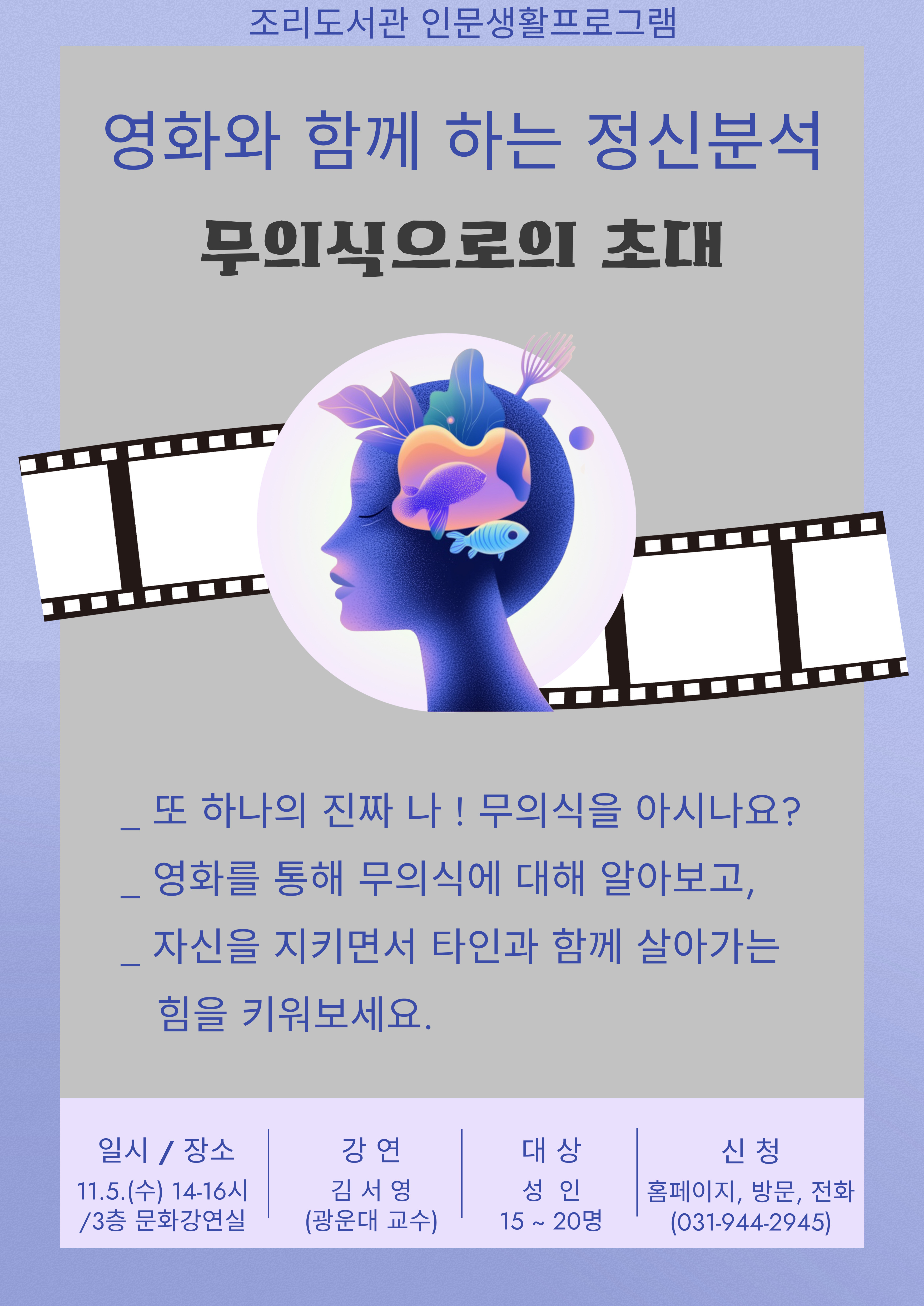 | 프로그램명 | 대기자접수 [조리도서관] 인문생활프로그램 <영화와 함께 하는 정신분석_무의식으로의 초대> |
