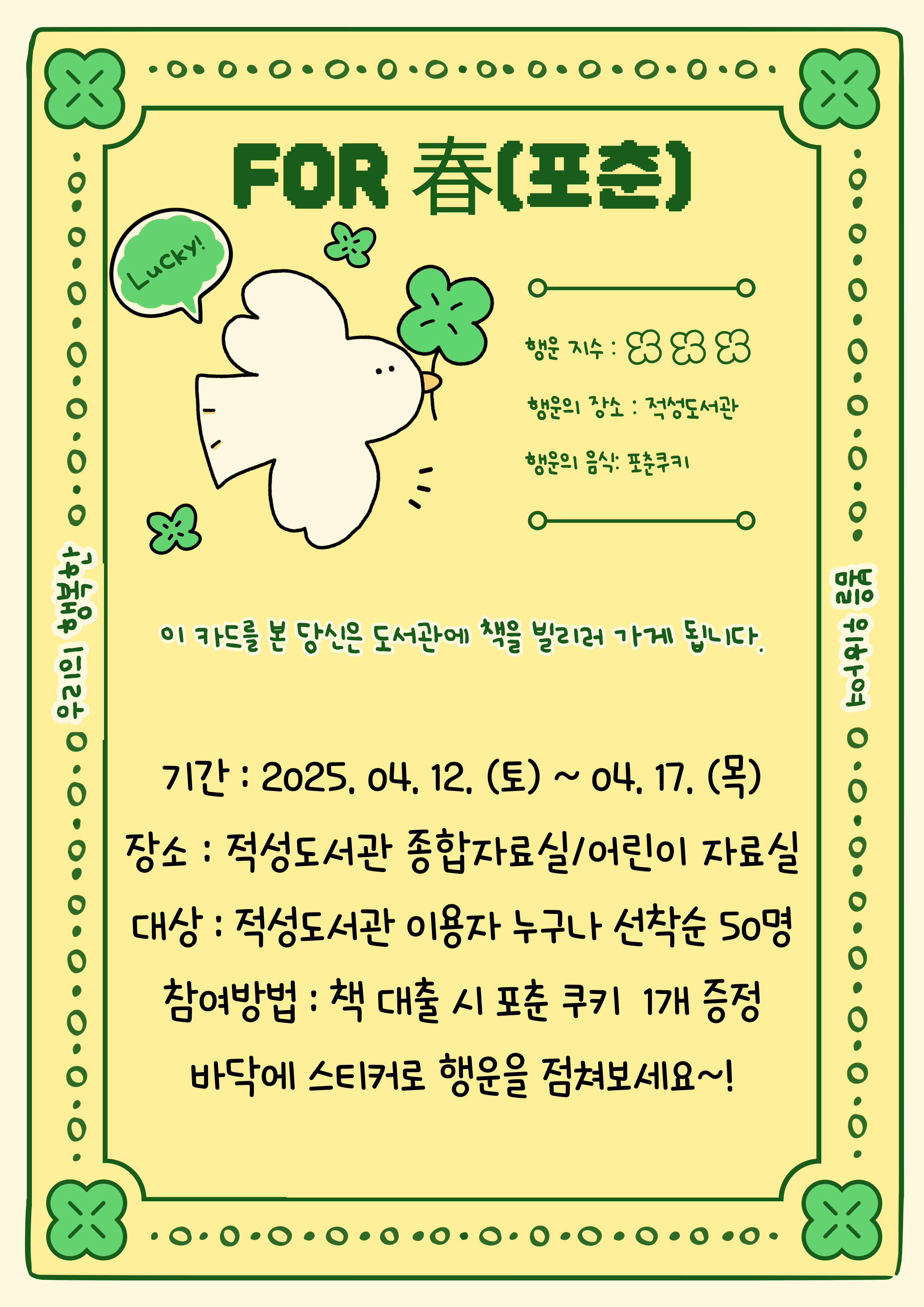 FOR 春(포춘)🌼 ○ 일 시 : 2025. 4. 12.(토)~4. 17.(목) ○ 장 소 : 어린이 자료실/종합자료실 ○ 대 상 : 적성도서관 이용자 누구나 50명(각 자료실별 25명/선착순) ○ 내 용 : 책 1권 대출 시 독서 명언이 담긴 포춘 쿠키 증정, 포춘쿠키 바닥스티커 유무에 따라 책갈피/북스토퍼 증정