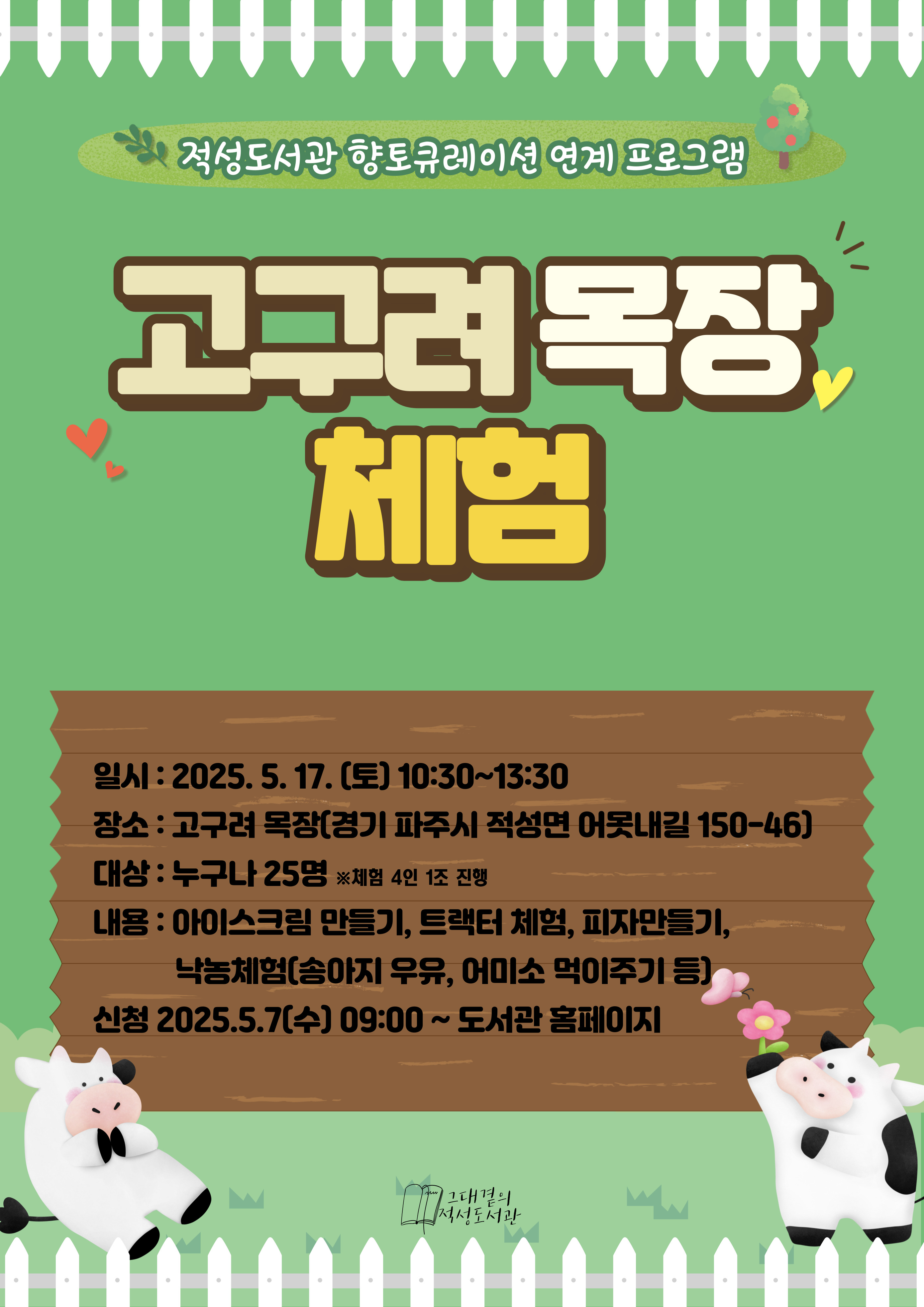 [적성도서관] 향토큐레이션 연계 프로그램 고구려 목장 체험 10시 30분부터 13시 30분까지 고구려 목장에서 아이스크림 만들기, 트랙터 체험, 피자 만들기, 낙농체험을 진행합니다. 참가신청 유의사항 ★ 5월 7일 (수) 9시부터 적성도서관 홈페이지를 통해 선착순으로 접수합니다. ★ 체험은 4인 1조로 이루어지며, 어린이 단독으로는 체험 활동이 불가하여 어른이 함께 동반하여 참여해야 합니다. ★ 1인 신청시 최대 2명 접수 가능하며, 참가자 성함도 함께 적어주세요. ★ 대기자는 참가 확정이 아닙니다. 취소자 발생 등 추가모집 가능 시, 대기 순서대로 연락드리겠습니다. ★ 참가 신청 후 무단 불참 시 추후 도서관 프로그램 신청에 페널티가 발생할 수 있습니다. 행사개요 ○ 일시: 2025. 5. 17.(토) 10:30~13:30 ○ 대상: 누구나 25명 ○ 장소: 고구려 목장(경기 파주시 적성면 어못내길 150-46) ○ 접수: 5. 7.(수) 9:00~ 홈페이지 접수, 1인 신청시 2명 접수 가능 ○ 문의: 031-940-8551