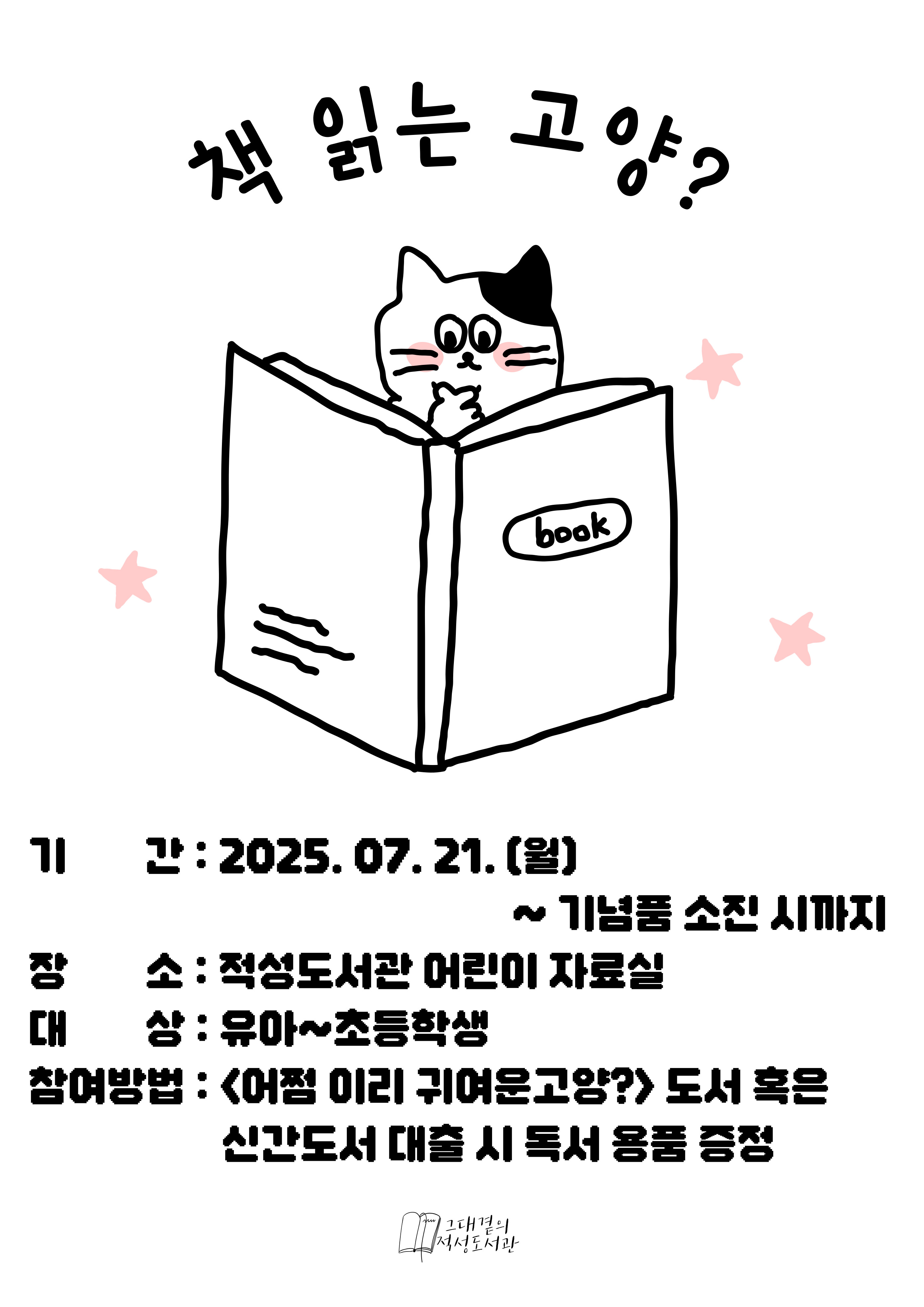 적성도서관 어린이실 여름방학 이벤트 <책 읽는고양?> 여름방학을 맞이한 어린이를 위한 독서이벤트를 운영합니다. 기간 동안 적성도서관 어린이 자료실에 방문하여 무궁무진컬렉션 <어쩜 이리 귀여운고양? > 도서 및 신간 도서 대출 시 고양이 독서 용품을 드립니다. 📌기간: 2025. 7. 21.(월) ~ 8. 10.(일) / 기념품 소진 시 종료 📌장소: 적성도서관 1층 어린이실 📌대상: 적성도서관 방문 어린이 30명 📌내용: 무궁무진컬렉션 도서 및 신간 도서 대출시 고양이 독서 용품 증정 📌문의: 031-940-8551
