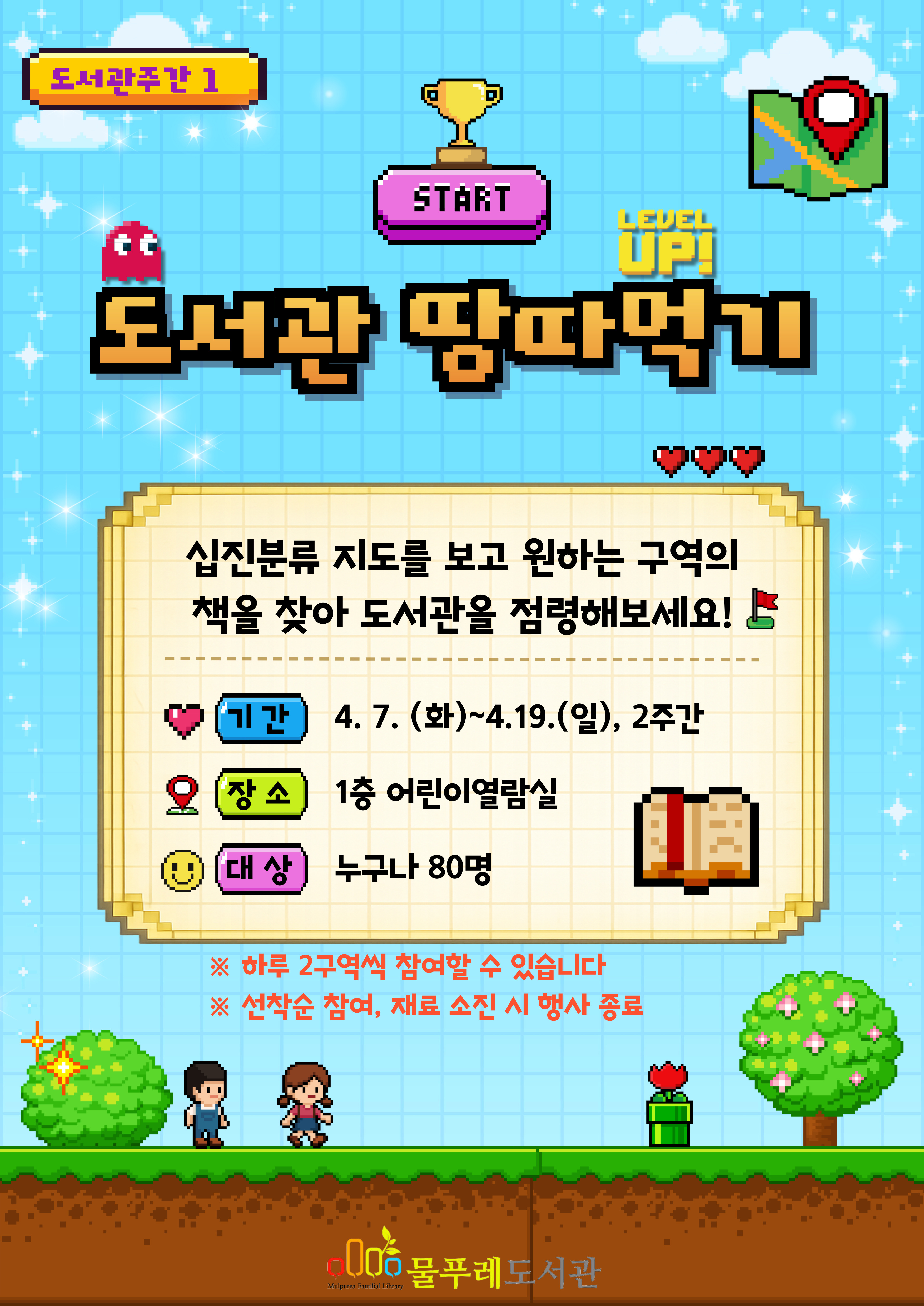 ![]() *본 홍보물은 미리캔버스에서 제작되었습니다. 도서관 땅따먹기 📍 십진분류표가 표시된 지도를 보고, 해당 구역의 책을 찾아 문장을 완성하세요! (ง •_•)ง 일 시 2026. 4. 7(화) ~ 2025. 4. 19(일) 2주간 장 소 1층 어린이열람실 대 상 누구나 80명 신 청 현장참여 ※하루 2구역씩 참여할 수 있음 ※선착순 참여, 재료 소진 시 행사 종료 |