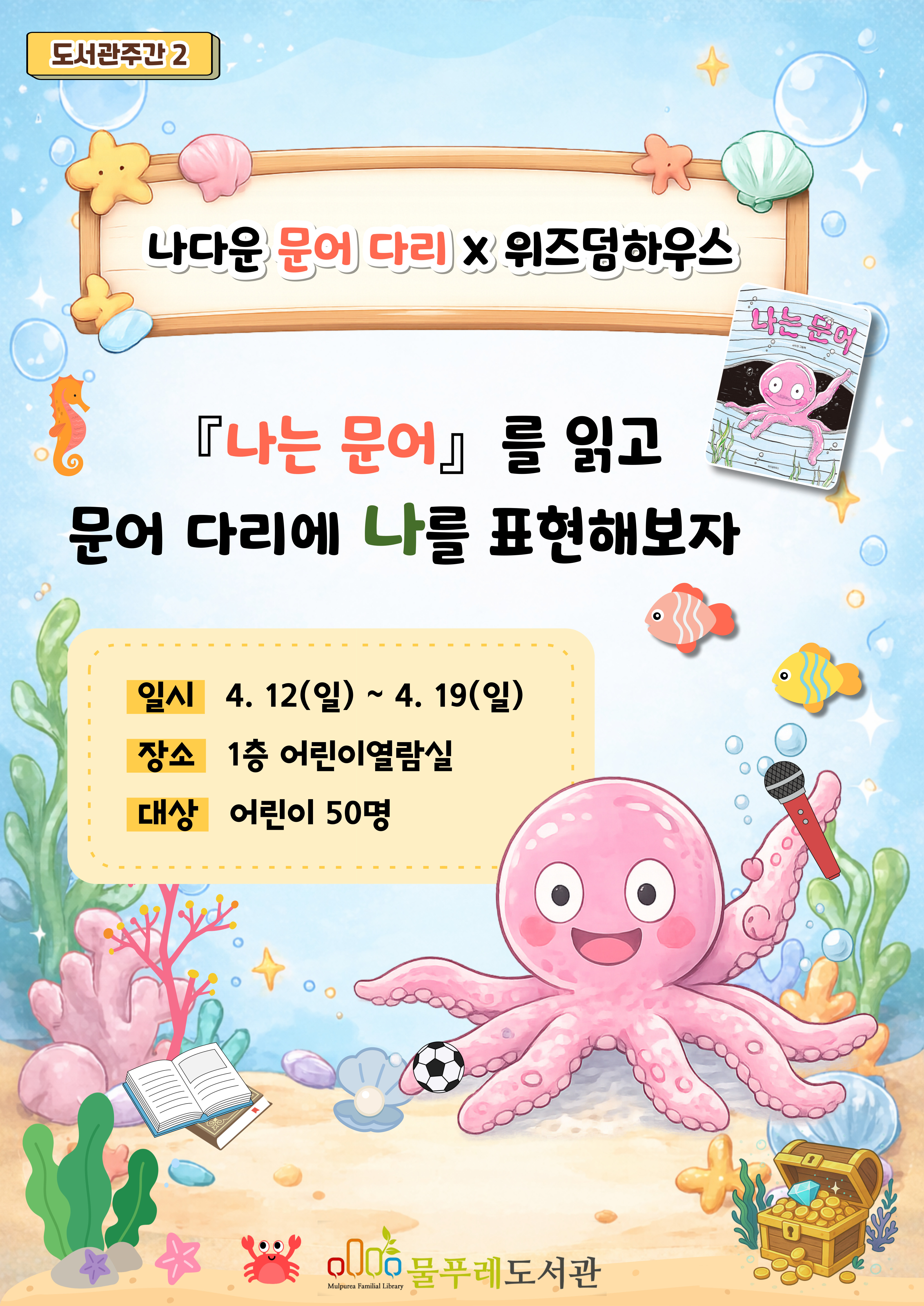 ![]() *본 홍보물은 미리캔버스에서 제작되었습니다. 🐙 나다운 문어 다리 🐟 『나는 문어』를 읽고 문어 다리에 나를 표현해보자 (●'◡'●) ◯ 일 시: 2026. 4. 12(일) ~ 2026. 4. 19(일) ◯ 장 소: 1층 어린이열람실 ◯ 대 상: 어린이 50명 ◯ 신 청: 현장참여 ※1인 1회 참여 ※선착순 참여, 재료 소진 시 행사 종료 |