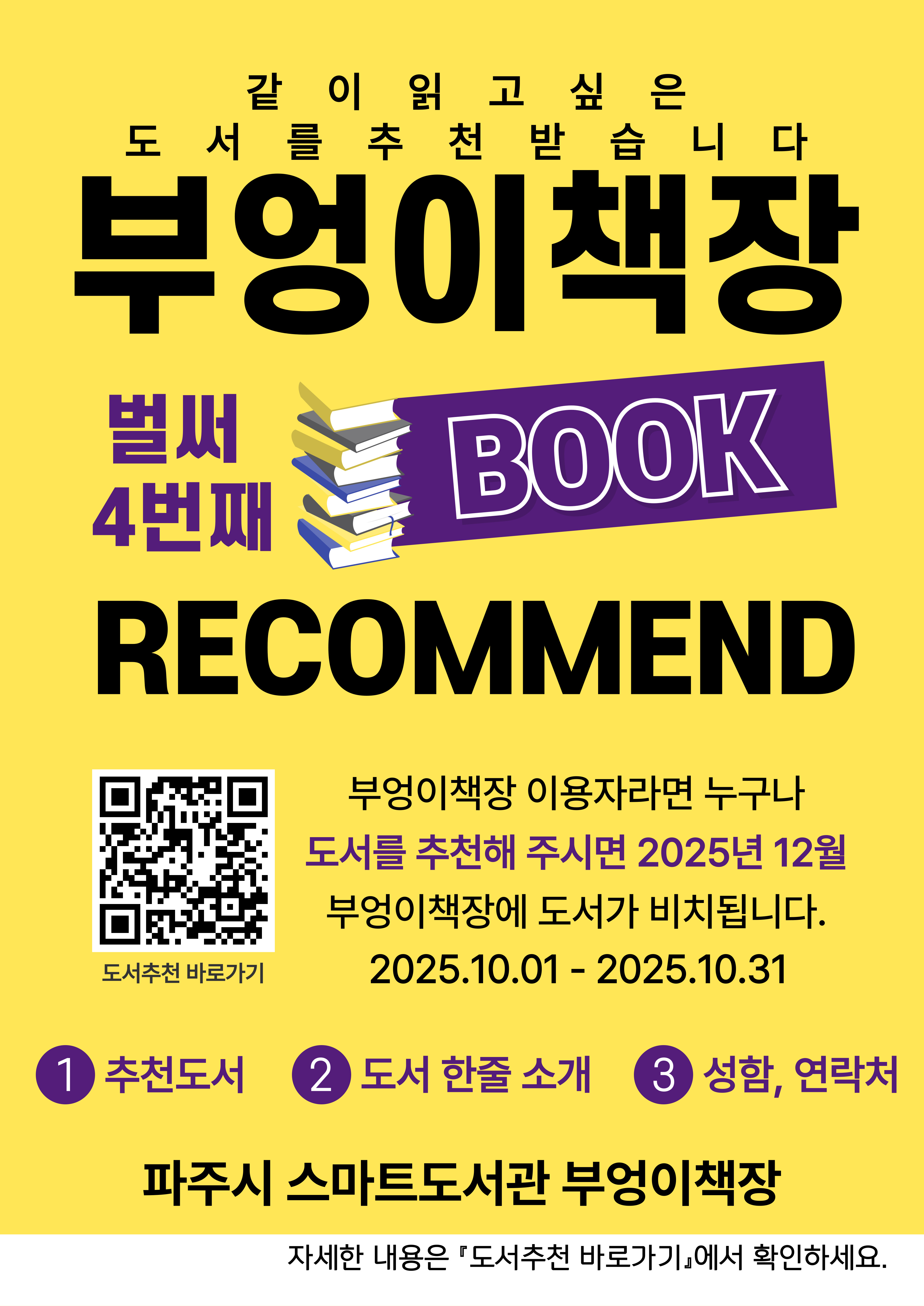 이용자들과 함께 읽고 싶은 도서를 추천 받습니다. <부엉이책장 도서추천 바로가기 클릭> 부엉이책장 이용자라면 누구나 추천가능하며, 선정된 도서는 2026년 1월에 부엉이책장 3곳(문산역/야당역/산내)에 비치 및 가람도서관 지하 1층 로비에 전시됩니다. 도서추천 기간 : 2025.10.01~2025.10.30 부엉이책장 070-4470-4847 |