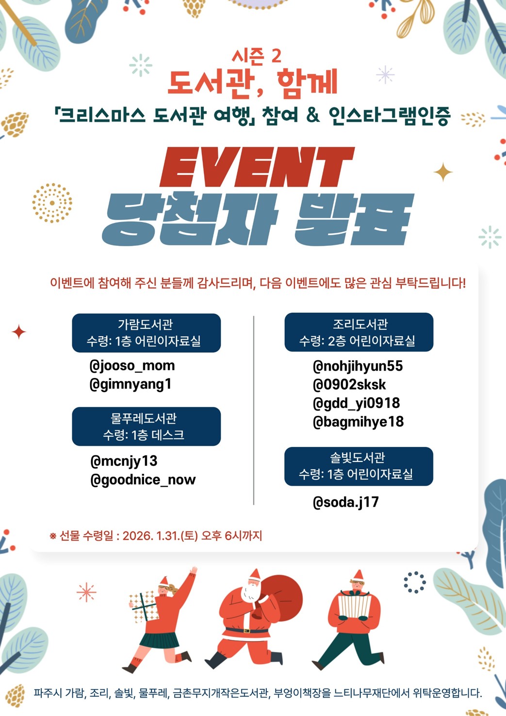 ![]() 파주시 위탁도서관 통합 인스타그램 이벤트 <도서관, 함께 시즌2> 당첨자 발표 이벤트 참여에 감사드리며, 당첨을 진심으로 축하드립니다.🎉 ★ 당첨선물: 파주시 지역서점 상품권 1만원권 ★ 🎁 선물 수령 안내 🔹 수령 도서관: 댓글에 남겨주신 도서관 ※ 수령 도서관 변경은 어려운 점 양해 부탁드립니다. 🔹 수령 기간: 2026년 1월 2일(금) ~ 1월 31일(토) 오후 6시까지 ※ 각 도서관 휴관일 확인 후 방문 부탁드립니다. 🔹 수령 시 DM 화면을 제시해 주시기 바랍니다. 📚 도서관별 수령 장소 및 문의처 ▶ 가람도서관: 1층 어린이자료실 (031-949-2552) ▶ 물푸레도서관: 1층 데스크 (031-944-5951) ▶ 조리도서관: 2층 어린이자료실 (031-944-2945) ▶ 솔빛도서관: 1층 어린이자료실 (031-944-8211) ▶ 무지개작은도서관: (031-941-2958) 차기 이벤트에도 많은 관심 부탁드립니다. 감사합니다. * 파주시 가람, 조리, 솔빛, 물푸레, 금촌무지개작은도서관, 부엉이책장을 느티나무재단에서 위탁운영합니다. |