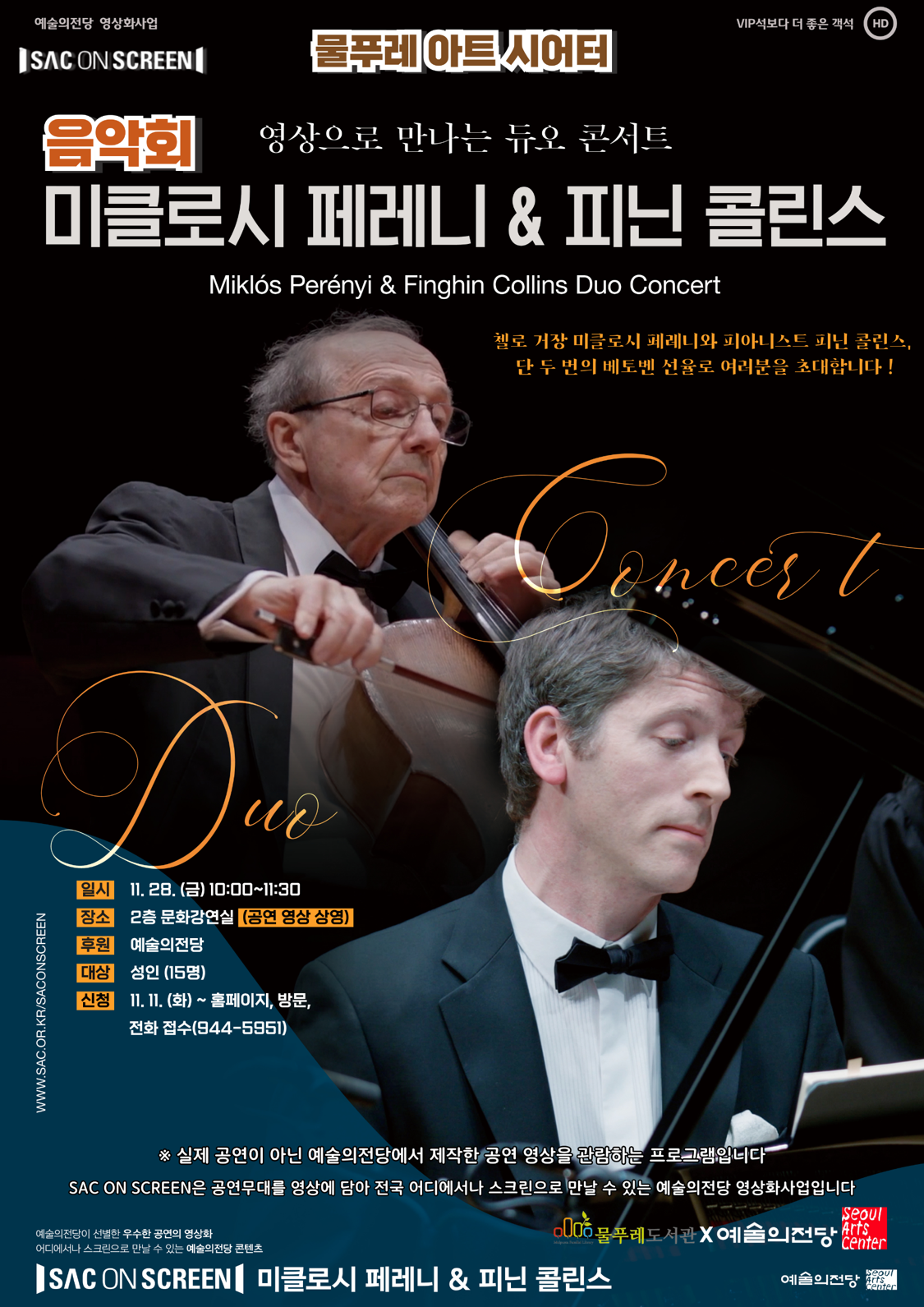 ![]() [SAC ON SCREEN] 물푸레 아트 시어터 음악회 <미클로시 페레니 & 피닌 콜린스 듀오 콘서트> 헝가리 첼로 거장 미클로시 페레니와 세계적 피아니스트 피닌 콜린스가 선보이는 베토벤 듀오 무대, 단 두 번의 깊은 울림을 만나는 특별한 시간. "영상"으로 물푸레도서관에서 만나봅니다. ㅇ 일시 : 2025. 11. 28.(금) 10시~11시30분(상영시간 90분) ㅇ 장소 : 2층 문화강연실 ㅇ 내용 : 첼로 거장 미클로시 페레니와 피아니스트 피닌 콜린스, 단 두 번의 베토벤 선율로 여러분을 초대합니다(영상 상영) ㅇ 대상 : 성인(15명 이내) ㅇ 신청 : 홈페이지, 방문, 전화접수(944-5951)