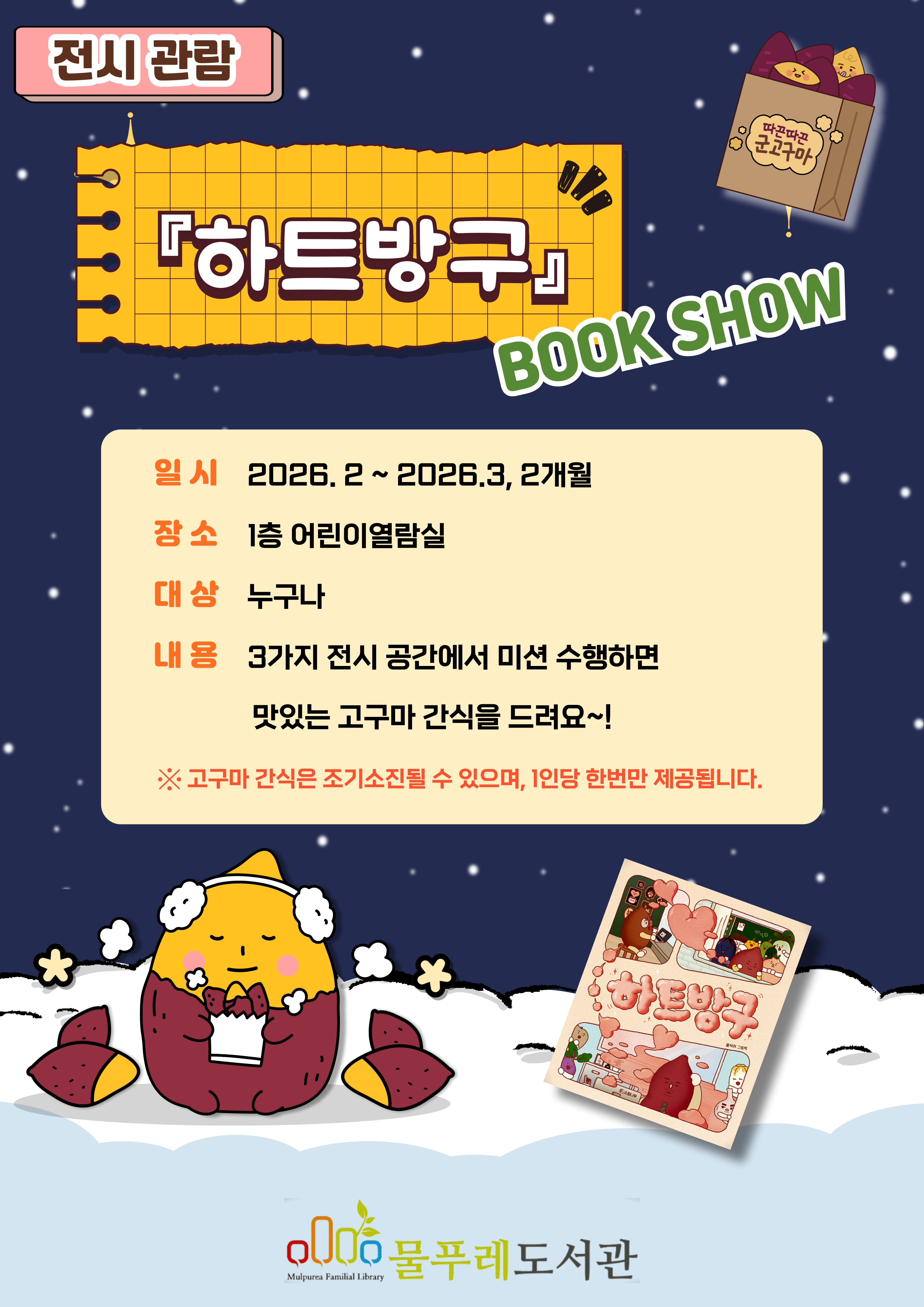 ![]() *본 홍보물은 미리캔버스에서 제작되었습니다. [전시 관람]『하트방구』북쇼 3가지 전시 공간에서 미션 수행하고 고구마 간식을 받자 (❁´◡`❁) [일시] 2026. 02. 04. (수) ~ 2026. 03. 29. (일), 약 2개월 [장소] 1층 어린이열람실 [대상] 누구나 (선착순 100명) *재료소진 시 조기종료 **행사 참여 방법** 1. 도서관에 방문하여 『하트방구』 북쇼 전시를 감상하세요! 2. 1층 데스크에서 도장판을 수령한 후 세 가지 공간에서 미션을 수행하세요! 3. 세 가지 미션을 모두 성공하면 고구마간식을 드려요~! |