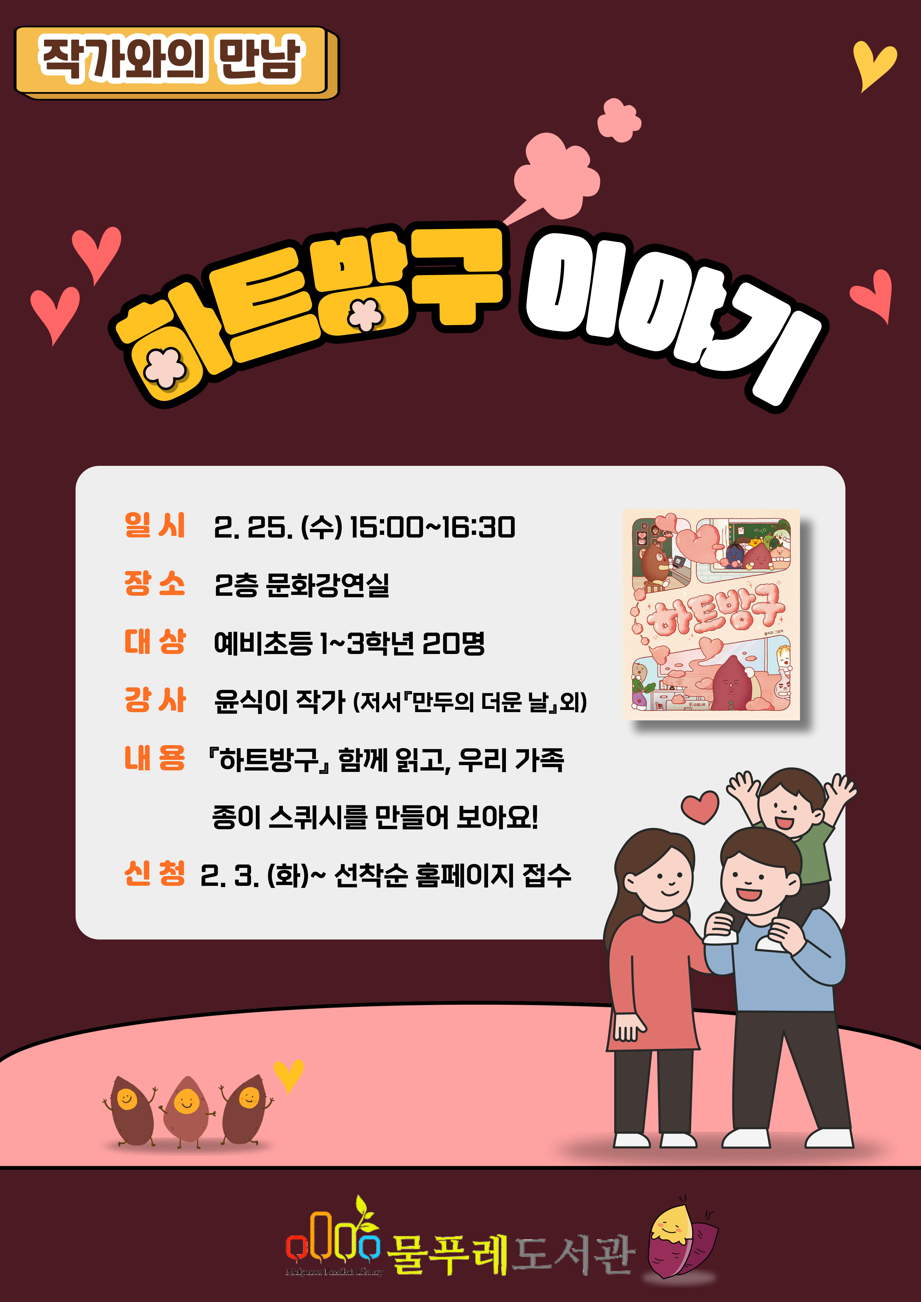 ![]() *본 홍보물은 미리캔버스에서 제작되었습니다. [윤식이 작가와의 만남] 하트방구 이야기 『하트방구』 함께 읽고, 우리 가족 종이 스퀴시를 만들어 보아요! ヽ(✿゚▽゚)ノ [일시] 2026. 02. 25. (수), 15:00~16:30 [장소] 2층 문화강연실 [대상] 예비초등 1~3학년 20명 [강사] 윤식이 작가 (저서 『만두의 더운 날』 외) [신청] 2. 3. (화)~ 선착순 홈페이지 접수 ※※프로그램 신청 시 1명씩 신청해주시기 바랍니다. (2자녀 신청 시 각각 신청) ※※비고란에 !!반드시!! 참여 어린이의 학년을 입력해주세요!!! 미입력 시 개별연락 없이 취소됩니다!!! |