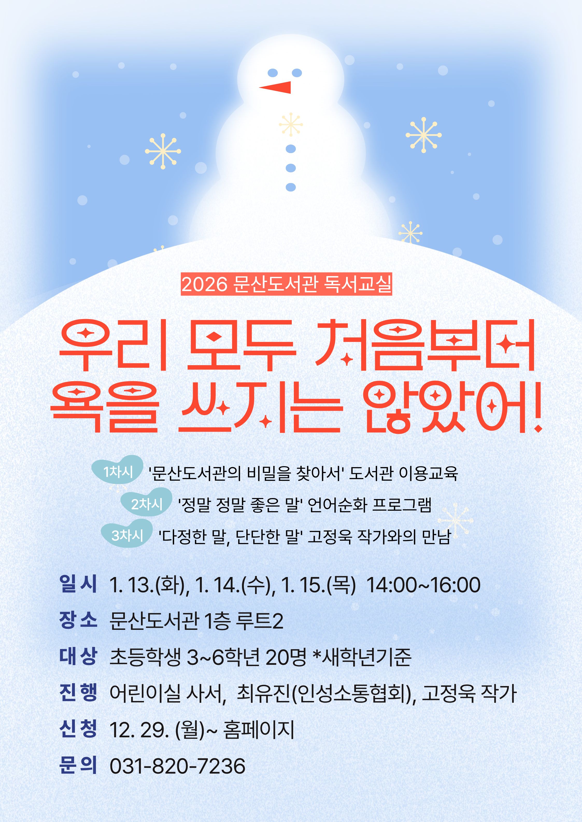 ※3일 모두 참석 가능한 어린이를 우선 모집합니다. 우리 모두 처음부터 욕을 쓰지는 않았어! 일시 2026. 1. 13.(화), 1. 14.(수), 1. 15.(목) 14:00~16:00장소 문산도서관 1층 루트2 대상 초등학생 3-6학년 20명 *26년 새학기 기준 강사 어린이실 사서, 최유진(인성소통협회), 고정욱 작가('가방 들어주는 아이', '아주 특별한 우리 형', '까칠한 재석이가 사라졌다' 저자) 신청 12. 29.(월) ~ 홈페이지 선착순 접수 내용 말의 힘을 알고 올바른 언어사용 방법을 배워보는 겨울독서교실! 세부내용