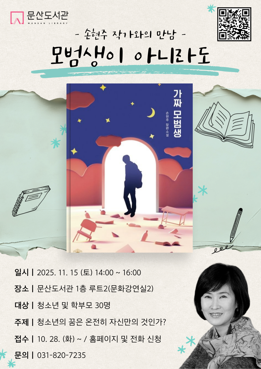 ![]() [손현주 작가와의 만남] 모범생이 아니라도 - 부모의 꿈이 아닌 나만의 꿈을 찾아 일시 11. 15.(토) 14:00~16:00 장소 문산도서관 루트2(문화강연실2) 대상 청소년 및 학부모 30명 강사 손현주 작가(「가짜 모범생 1,2」저) 내용 부모의 꿈이 아닌 나만의 꿈을 찾아가는 진솔한 이야기를 나누며, 진짜 '나'를 찾아가는 시간을 가집니다 신청 10. 28. (화) ~ 홈페이지, 전화 및 대면 신청 전화 031-820-7235, 031-820-7250 |