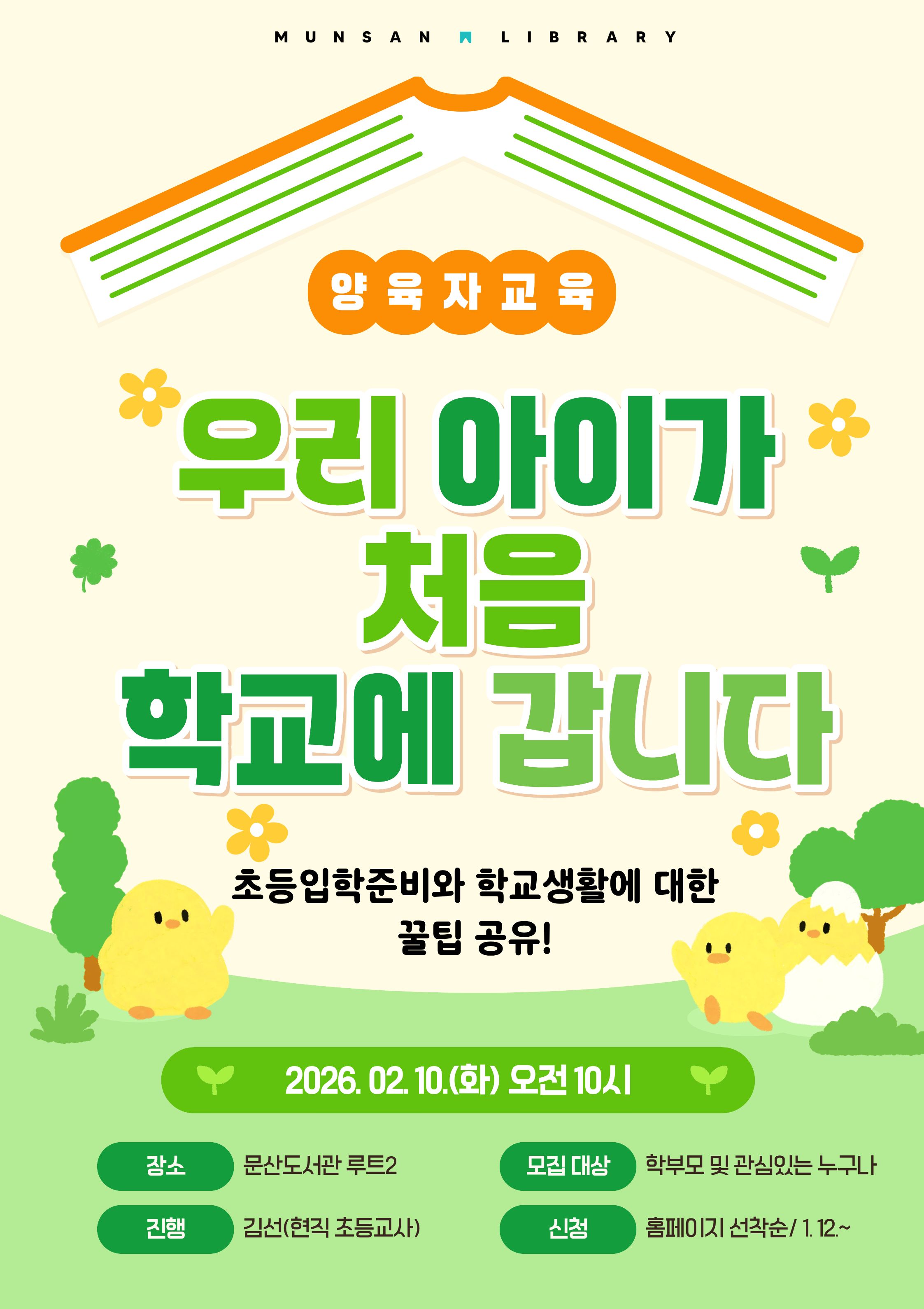 ※무단으로 당일불참 2회 이상 시 3개월동안 프로그램 신청이 불가합니다. 우리 아이가 처음 학교에 갑니다 일시 2026. 2. 10.(화) 10:00 ~ 12:0 내용 초등학교 입학을 앞둔 자녀를 둔 양육자를 대상으로 초등 1학년 학교생활 이해 및 입학 전까지 하면 좋을 교육과 필수 정보 안내 • 입학 전 기본 생활·학습 준비 • 입학 전 꼭 알아야 할 정보 • 초등 1학년 학교생활 이해 • 교과서 밖에서 필요한 성장 교육 |