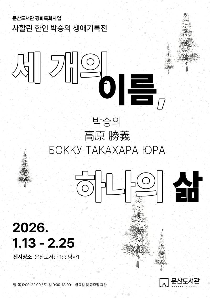 [문산도서관 평화특화전시] 세 개의 이름, 하나의 삶 - 사할린 한인 박승의 생애기록전 사할린의 조선인들은 대부분 일제에 의해 강제징용으로 끌려간 사람들이었다. 제2차 세계대전 이후 일본이 패전하면서, 사할린에 남겨진 4만 명이 넘는 조선인들은 귀환하지 못한 채 새로운 체제 속에서 살아가야 했다. 국경과 체제가 바뀌는 동안 사람들은 이름과 언어, 삶의 조건을 계속해서 바꿔야 했다. 《세 개의 이름, 하나의 삶》은 이러한 사할린 한인의 역사를 한 사람의 생애를 통해 살펴보고자 한다. 박승의는 사할린 강제징용 가족으로 태어나 조선인 박승의로, 일본인 다카하라 가쯔요시로, 소련 시기에는 보꾸 다카하라 유라로 살아왔다. 국적과 무국적 상태를 오가며 이어진 그의 삶은 개인의 선택이 아니라, 사할린 한인이 처했던 역사적 조건의 결과였다. 박승의의 생애는 사할린에서의 출생과 성장, 한국어 교육자로서의 활동, 그리고 2009년 영주귀국 이후 한국 사회에서의 삶까지 이어진다. 이를 통해 관람객이 사할린 한인의 역사를 과거에 머문 이야기가 아닌, 오늘의 삶과 연결된 역사로 다시 바라볼 수 있기를 바란다. 📍 전시 정보 • 전시기간: 2026. 1. 13. (화) – 2. 25. (수) • 운영시간: 평일 9:00–22:00, 주말 9:00–18:00 *매주 금요일 휴관 • 전시장소: 문산도서관 1층 탐사1 • 관람료: 무료 • 전시내용: 박승의의 생애 기록과 소장 기록물을 통해 사할린 한인 동포들의 역사와 삶 조명 📞문의: 문산도서관 도서관운영팀(031-820-7240) ![]() |