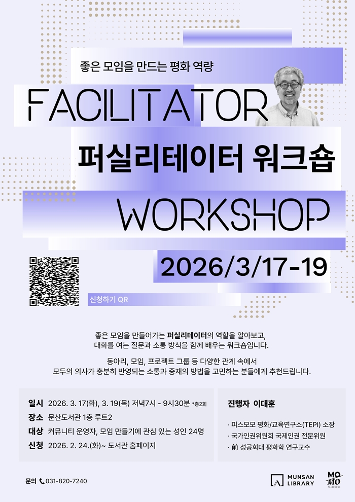 [평화교육] 퍼실리테이터 워크숍 : 좋은 모임을 만드는 평화 역량 좋은 모임을 만들어가는 ‘퍼실리테이터’의 역할을 알아보고, 대화를 여는 질문과 소통 방식을 함께 배우는 워크숍입니다. 동아리, 모임, 프로젝트 그룹 등 다양한 관계 속에서 모두의 의사가 충분히 반영되는 소통과 중재의 방법을 고민하는 분들에게 추천드립니다. 📍퍼실리테이터란? 그룹의 구성원들이 효과적인 기법과 절차게 따라 적극적으로 참여하도록 하고, 상호작용을 촉진하여 모임의 목적을 달성하도록 돕는 전문가 ![]() 📍강의개요 - 일시: 2026. 3. 17(화) / 3. 19(목) 19:00~21:30 (2시간30분, 총2회) - 장소: 문산도서관 1층 루트2 - 대상: 커뮤니티 운영자, 모임 만들기에 관심 있는 성인 24명 - 강사: 이대훈 · 피스모모 평화/교육연구소(TEPI) 소장 · 국가인권위원회 국제인권 전문위원 · 前 성공회대 평화학 연구교수 - 신청: 2. 24.(화)~ 도서관 홈페이지 - 문의: 평화특화사업 담당사서(031-820-7240) 📍이런분들께 추천드려요! ✔️ 직장, 모임, 그룹 등 사람들과의 효과적인 소통을 고민하는 분들 ✔️ 서로 힘을 주는 대화, 질문, 토론 방법을 배우고 싶은 분들 ✔️ 모임 리더, 중간 관리자, 교육 담당자로서 사람들의 참여와 배움을 촉진하고 싶은 분들 📍워크숍 내용 및 주의사항 - 본 프로그램은 직접 참여하고 경험하는 몸 활동을 포함한 워크숍입니다. - 매 회 2부로 나뉘며 중간에 10분간 휴식을 취합니다. - 독서자료와 책상 없이 약간의 강의를 곁들인, 실습형 연습과 역량 익히기 중심의 워크숍입니다. - 2회차 모두 꼭 참여 가능하신 분만 신청부탁드립니다.