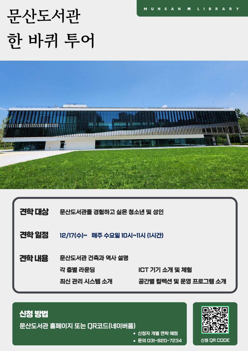 [문산도서관 시설 견학 프로그램] <문산도서관 한 바퀴 투어> 새로 개관한 문산도서관, 같이 한 바퀴 투어해요! 일정: 매주 수요일 10:00~11:00 (1시간) 대상: 문산도서관을 경험하고 싶은 청소년 및 성인 장소: 문산도서관 1~3층 내용: 문산도서관 건축과 역사 설명 각 층별 라운딩 최신관리 시스템 소개 ICT기기 소개 및 체험 공간별 컬렉션 및 운영프로그램 소개 신청방법: 문산도서관 홈페이지 또는 qr코드 (네이버폼) 신청자 개별 연락 예정 문의 031-820-7234 ![]() |