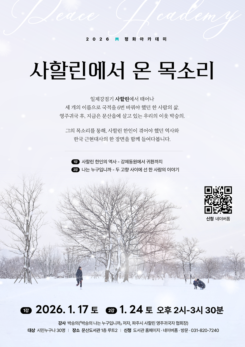 "나는 이 세상에서 살면서 6번이나 국적을 바꾸었다. 그것도 자의가 아닌 타의로!" 일제강점기 사할린에서 태어나 세 개의 이름으로 국적을 6번 바꿔야 했던 한 사람의 삶. 영주귀국 후, 지금은 문산읍에 살고 있는 우리의 이웃 박승의. 그의 목소리를 통해, 사할린 한인이 겪어야 했던 역사와 한국 근현대사의 한 장면을 함께 들여다봅니다. [문산도서관 평화아카데미①] 사할린에서 온 목소리 일시 2026. 1. 17(토) / 1. 24(토) 14:00~15:30 장소 문산도서관 1층 루트2 대상 시민누구나 30명 강사 박승의(「박승의 나는 누구입니까」 저자, 파주시 사할린 영주귀국자 협회장) 신청 12. 30. (화) ~ 홈페이지, 네이버폼, 방문, 전화(031-820-7240) 강연내용 [1강] 사할린 한인의 역사 - 강제동원에서 귀환까지 [2강] 나는 누구입니까 - 두 고향 사이에 선 한 사람의 이야기 신청방법 1. 아래 '수강신청' 버튼 2. 네이버폼 접수 / 아래 링크를 눌러주세요▼ https://naver.me/ID3UfNXS ![]() 작가 소개 | 박승의 1942년 사할린 남부 가라후토 출생 전 사할린대학교 경제 및 동양학대학 교수 전 사할린 주 한인 협회 이사, 사할린 주 한국어 교원협회 회장 故 박노학 회장 기념사업 추진위원회 회장 현 사할린 주 한인역사 연구원, 파주시 사할린 영주귀국자 협회 회장, 디아스포라 문화원 원장 ![]() 책 소개 | 『박승의 나는 누구입니까』 박승의 지음, 구름바다, 2019 "일제강점기시대 1942년에 사할린 땅에서 태어나 해방까지 3년은 일본 국민으로, 1945년 해방 후에는 무국적자로, 1958년에는 북한 공민으로, 1970년대에는 소련 국적자로, 1990년 소련 붕괴 후에는 러시아 연방 국민으로, 2010년 영주 귀국하여 마침내 대한민국 국민으로 삶을 이어간다." - 책 속에서 일제강점기 사할린 강제징용 가족의 수난과 극복에 대한 박승의 역사에세이다. 박승의는 러시아 사할린 남부 가라후토에서 강제징용으로 끌려온 아버지와 뒤따라 이주해온 어머니 사이에서 1942년 일본 국적을 가진 조선아이로 태어났다. 일본이 패망한 이후 사할린에도 해방이 찾아왔으나 조선인은 무국적자로 억류되어 고향땅에 못가고 50여 년 동안 사할린의 노동력으로 쓰였다. 출처_알라딘 |