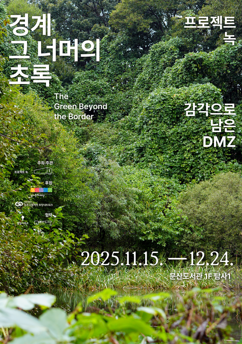 [지역협력 평화특화전시] 경계, 그 너머의 초록 - 감각으로 남은 DMZ 비무장지대, 누군가에겐 일상이자 누군가에겐 경계인 땅. 이곳의 초록은 오랜 시간 사람의 손과 발자국 사이에서 닳아왔으며, 그 안에는 여전히 살아 있는 생태와 사람의 이야기가 겹겹이 쌓여있습니다. 이번 전시는 그러한 DMZ의 풍경을 영상과 사진, 소리의 감각으로 녹여낸 기록입니다. 제한된 접근 속에서도 이어지는 사람들의 삶, 인간의 발길이 닿지 않아 보존된 자연, 그리고 기후위기로 변화된 환경 속에서 다시 피어나는 초록의 순간들을 담았습니다. 《경계, 그 너머의 초록》은 경계의 선 위에서 이어지는 사람과 자연의 관계를 바라보며, 공존의 방식을 다시 묻는 전시입니다. "경계의 끝에서, 당신은 어떤 '녹'을 마주하고 있나요?" ![]() 📍 전시 정보 • 전시기간: 2025. 11. 15. (토) – 12. 24. (수) • 운영시간: 평일 9:00–22:00, 주말 9:00–18:00 *매주 금요일 휴관 • 전시장소: 문산도서관 1층 탐사1 • 관람료 : 무료 • 전시내용 - 파주 DMZ의 생태를 시청각 매체로 기록하여 경계 지역의 사람과 자연의 공존을 탐색 - 연계 생태사진전 《경계의 생명들》, 컬렉션 《DMZ, 초록의 경계에서》 동시 운영 📍 도슨트 운영 • 11. 20. (목)부터 매주 화·목요일 15:00 현장참여 가능 (회차당 약 15분 진행) 📍 관람 안내 • 누구나 자유롭게 관람할 수 있습니다. • 행사 및 도슨트 일정은 상황에 따라 변동될 수 있습니다. • 자세한 내용은 홈페이지를 참고해주세요. 기획·주관 | 프로젝트 녹, DMZ 문화예술공간 통 후원 | 경기문화재단, (사)농촌소멸지역희망네트워크 협력 | 별일사무소, 파주시 문산도서관 📞문의: 문산도서관 도서관운영팀(031-820-7240) |