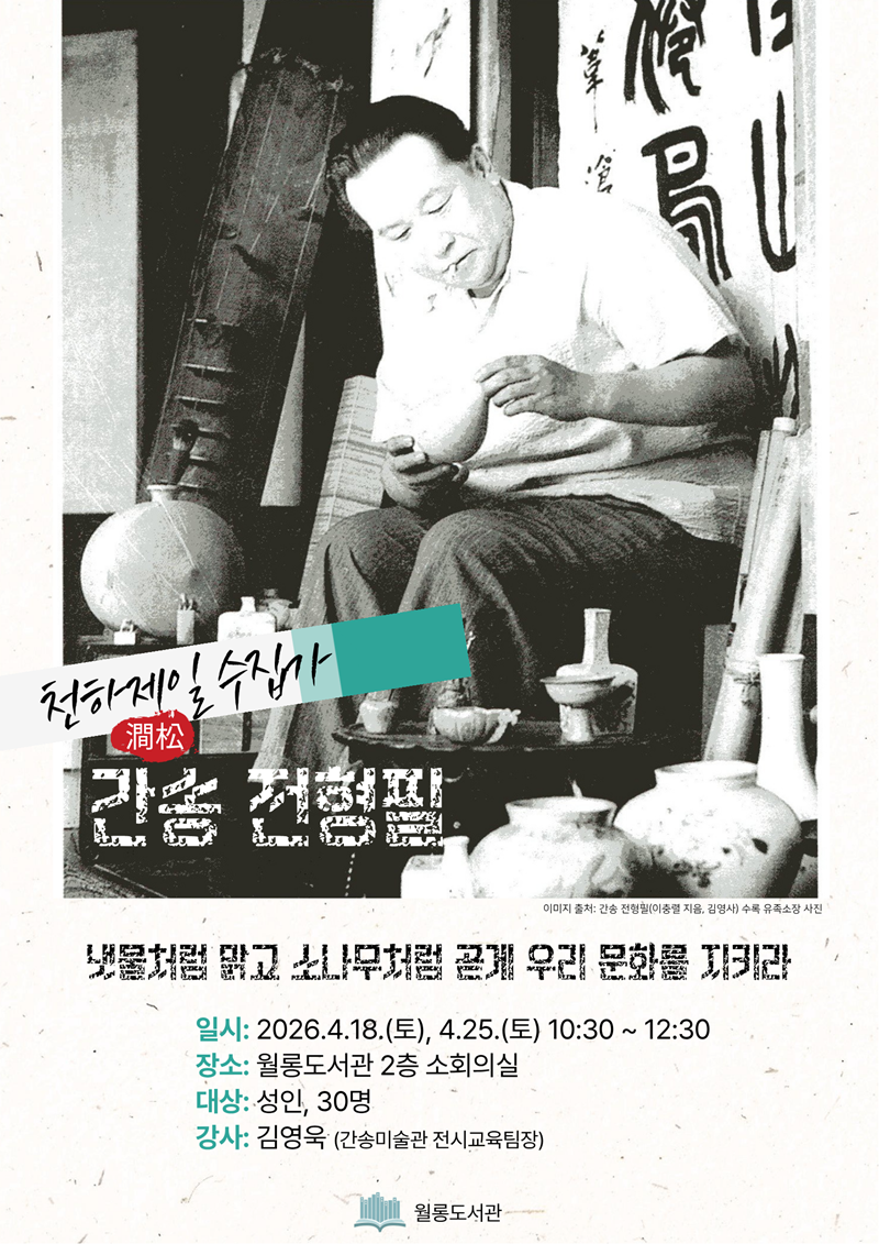 [2026년 도서관주간 역사강연] 천하제일 수집가, 간송 전형필 냇물처럼 맑고 소나무처럼 곧게 우리 문화를 지키라 ♦ 일시: 1차시- 4.18.(토) / 2차시-4.25.(토) 각 10:30~12:30 (2시간) ♦ 장소: 월롱도서관 2층 소회의실 ♦ 대상: 성인, 30명 ♦ 강사: 김영욱 팀장(서울간송미술관 전시교육팀장) ♦ 신청: 4.1.(수) 부터 홈페이지 ♦ 문의전화: 031-940-8563 ! 강연시작시간이 10시 30분입니다. ! 강연장이 다소 협소하여 수용인원이 많지 않습니다. 신청을 서두르세요~