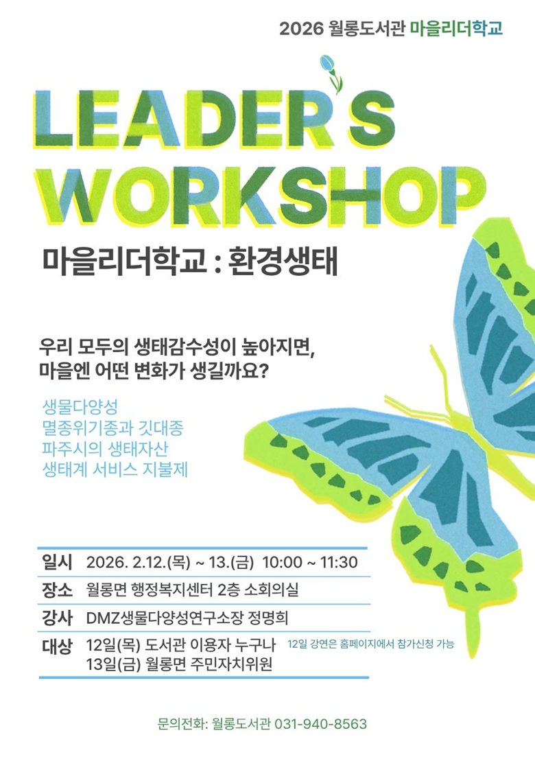 ! 2월 12일(목) 강연만 온라인 신청이 가능합니다. 마을리더학교: 환경생태 강연회 리더가 배워야 마을이 산다 ♦ 일시: 2.12.(목) ~ 13.(금) 10:00~11:30 ♦ 장소: 월롱면 행정복지센터 2층 소회의실 ♦ 대상: 성인, 월롱면 주민자치위원 ♦ 강사: 정명희 소장 (DMZ생물다양성연구소) ♦ 내용: 1회차(2.12.목) - 생물다양성의 개념과 구성요소 생물다양성의 가치와 중요성 파주 생태계 특징과 환경자원의 특성 2회차(2.13.금) - 생태계 서비스 지불제의 개념과 운영구조 월롱면 생태가치의 이해 월롱면 생태자산을 기반으로 하는 모델링 기초 ♦ 신청방법: 홈페이지 ! 2월 12일(목) 강연만 온라인 신청이 가능합니다. ! 2월 13일(금) 강연은 월롱면 주민자치회 총회 프로그램으로 진행됩니다. ♦ 문의전화: 031-940-8563